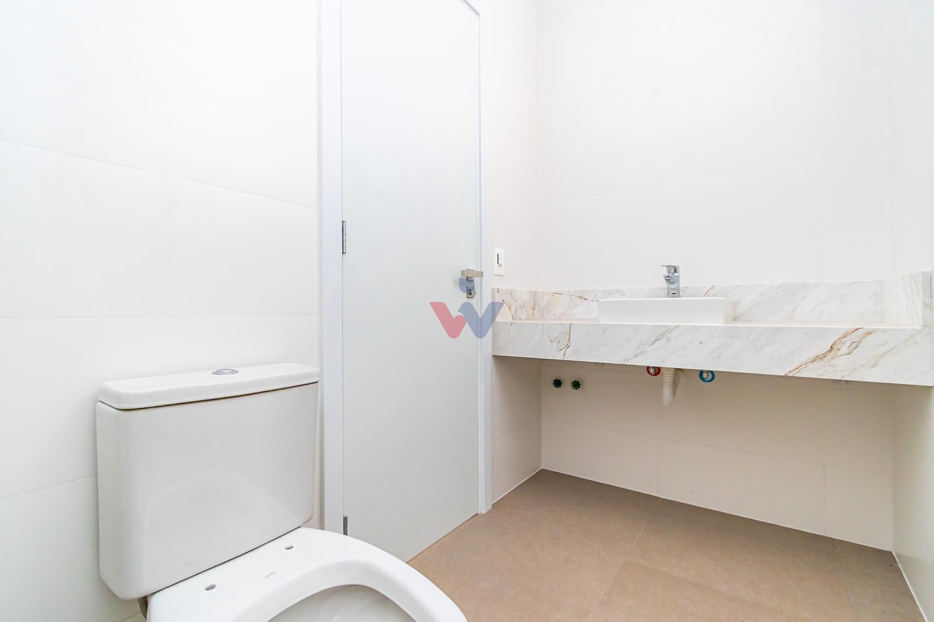 Porcelanato de grandes formatos na área social e tampos em mármore nos banheiros.