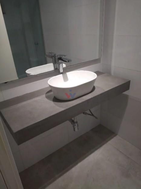 Banheiro sofisticado, com bancada esculpida e acabamento contemporâneo