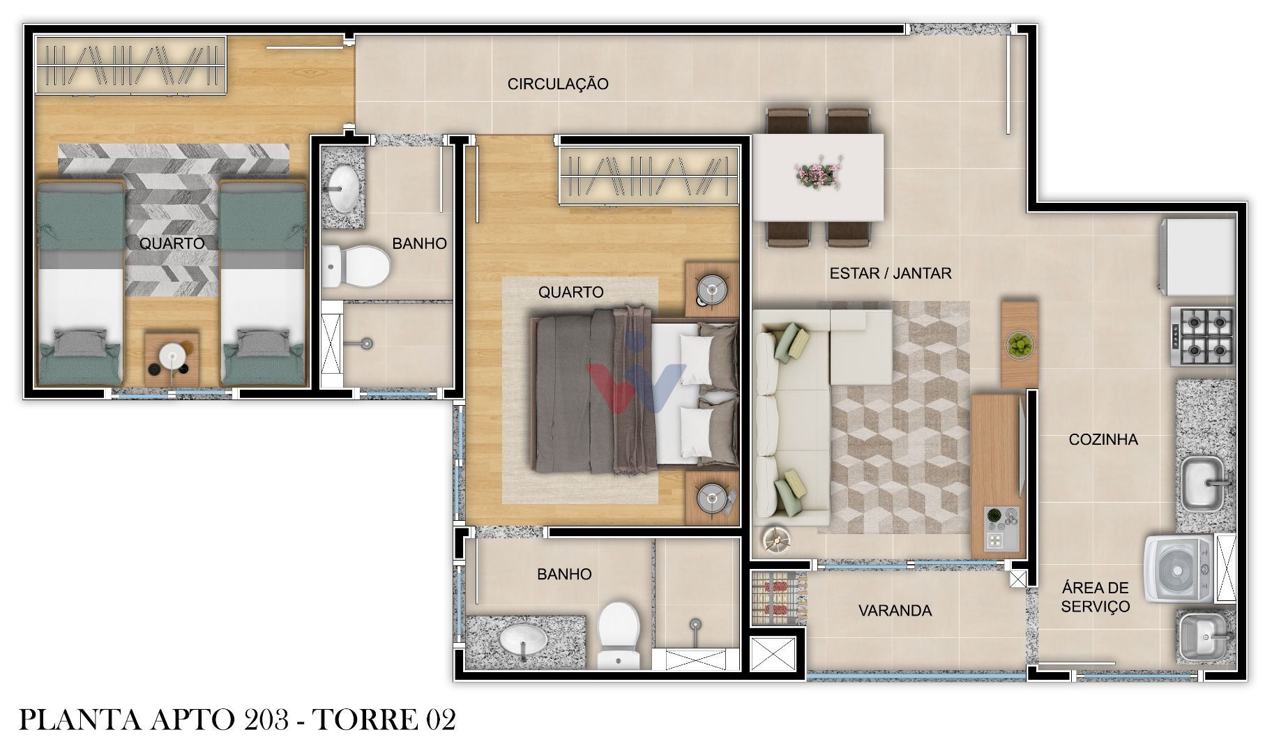 2 quartos, sendo 1 suíte aconchegante