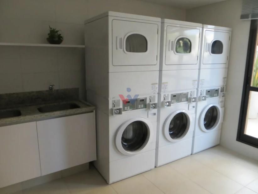 Lavanderia equipada com lavadoras e secadoras, além de sala de espera