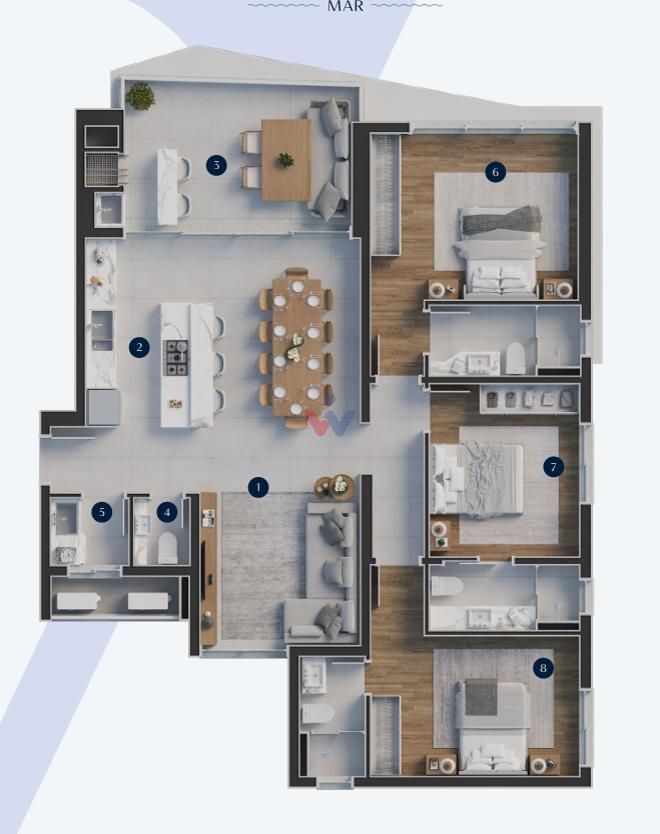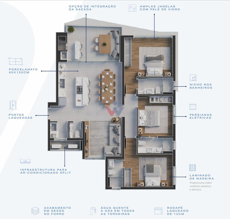 * Amplo living integrado (estar/jantar/cozinha) com opção de integração da sacada