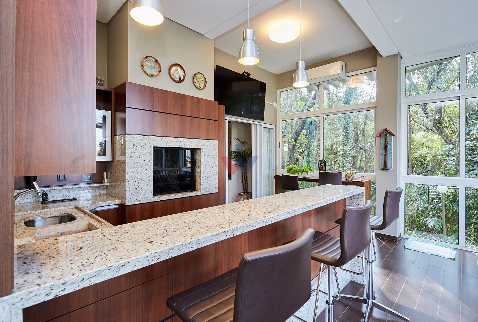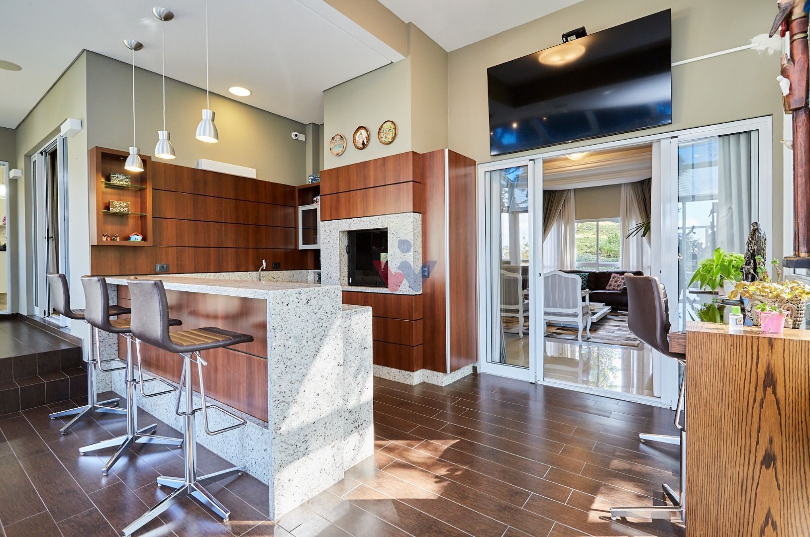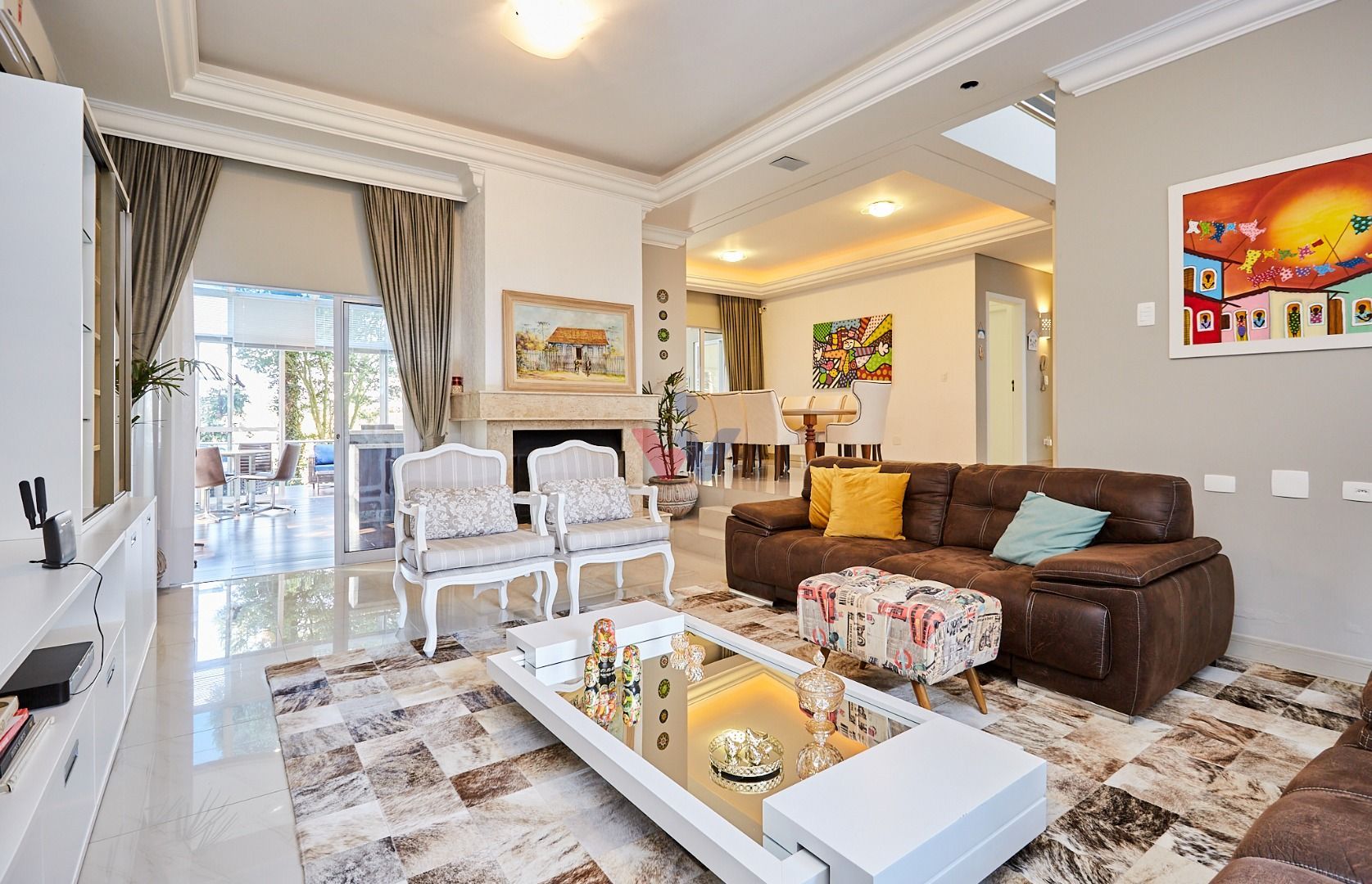 Área social integrada e elegante: salas de estar e jantar com lareira, home theater, lavabo e espaço gourmet conectado ao deck e à cozinha planejada.