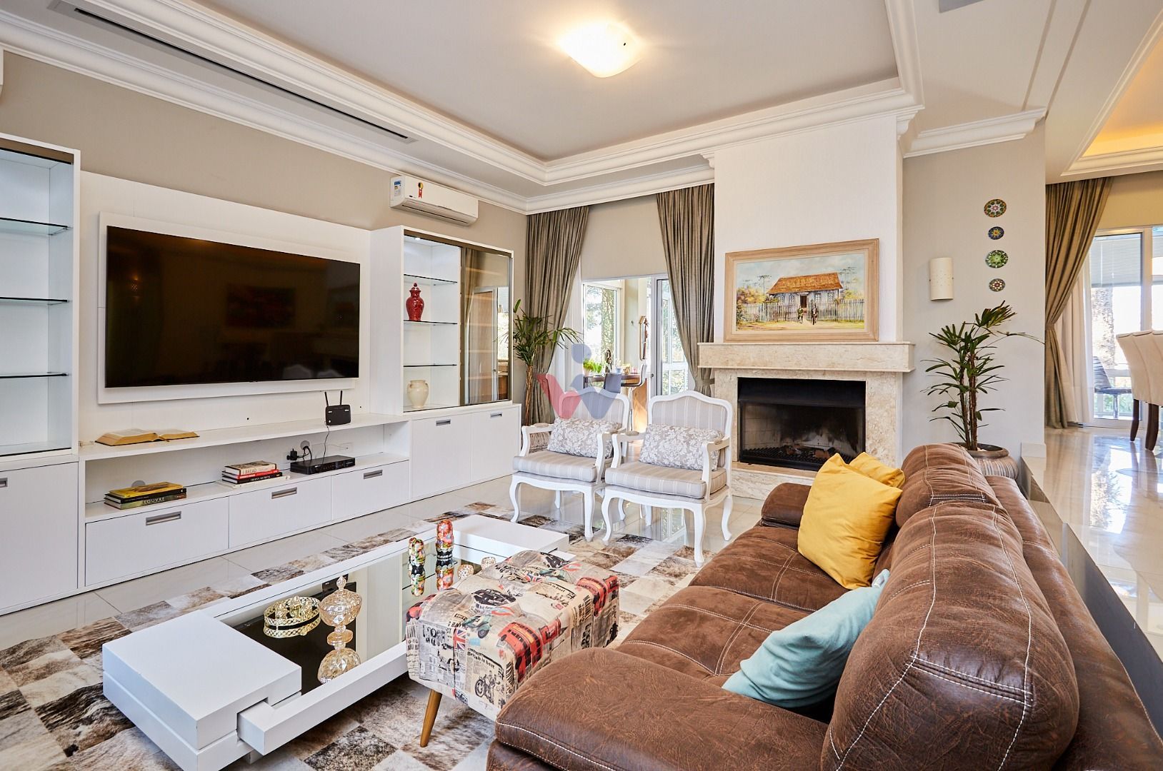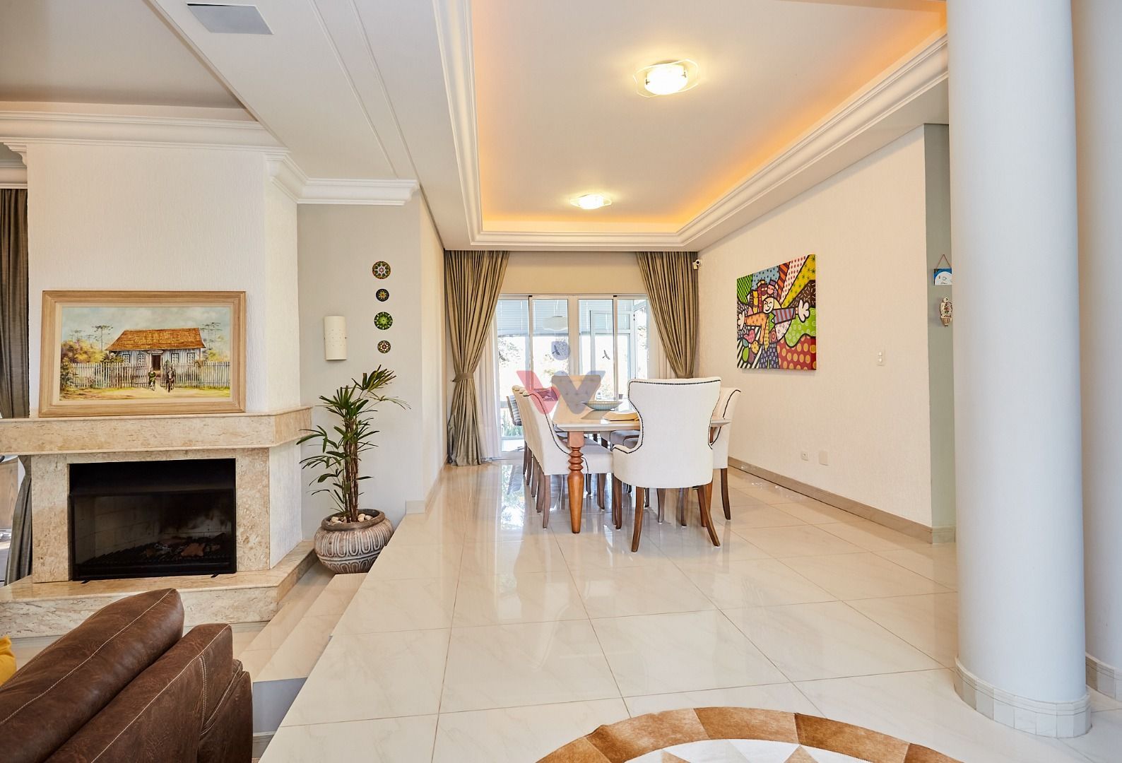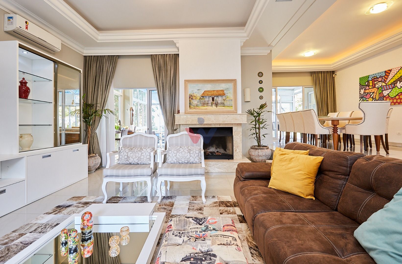 Área social integrada e elegante: salas de estar e jantar com lareira, home theater, lavabo e espaço gourmet conectado ao deck e à cozinha planejada.