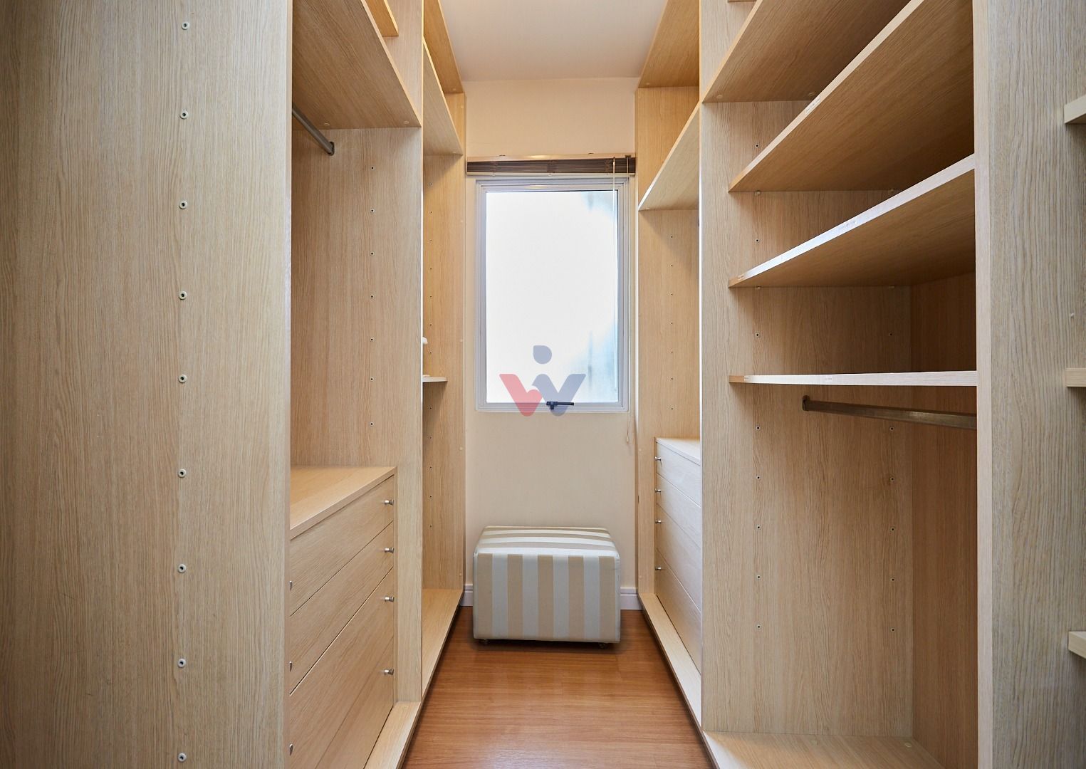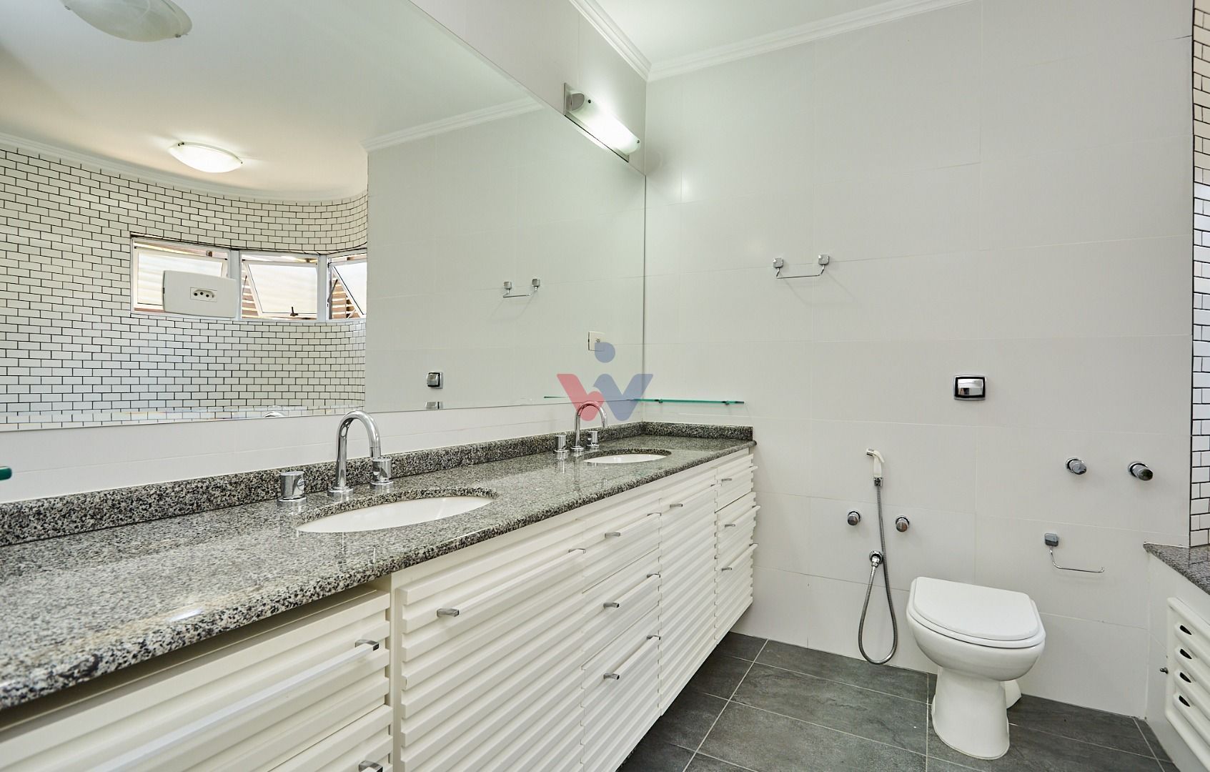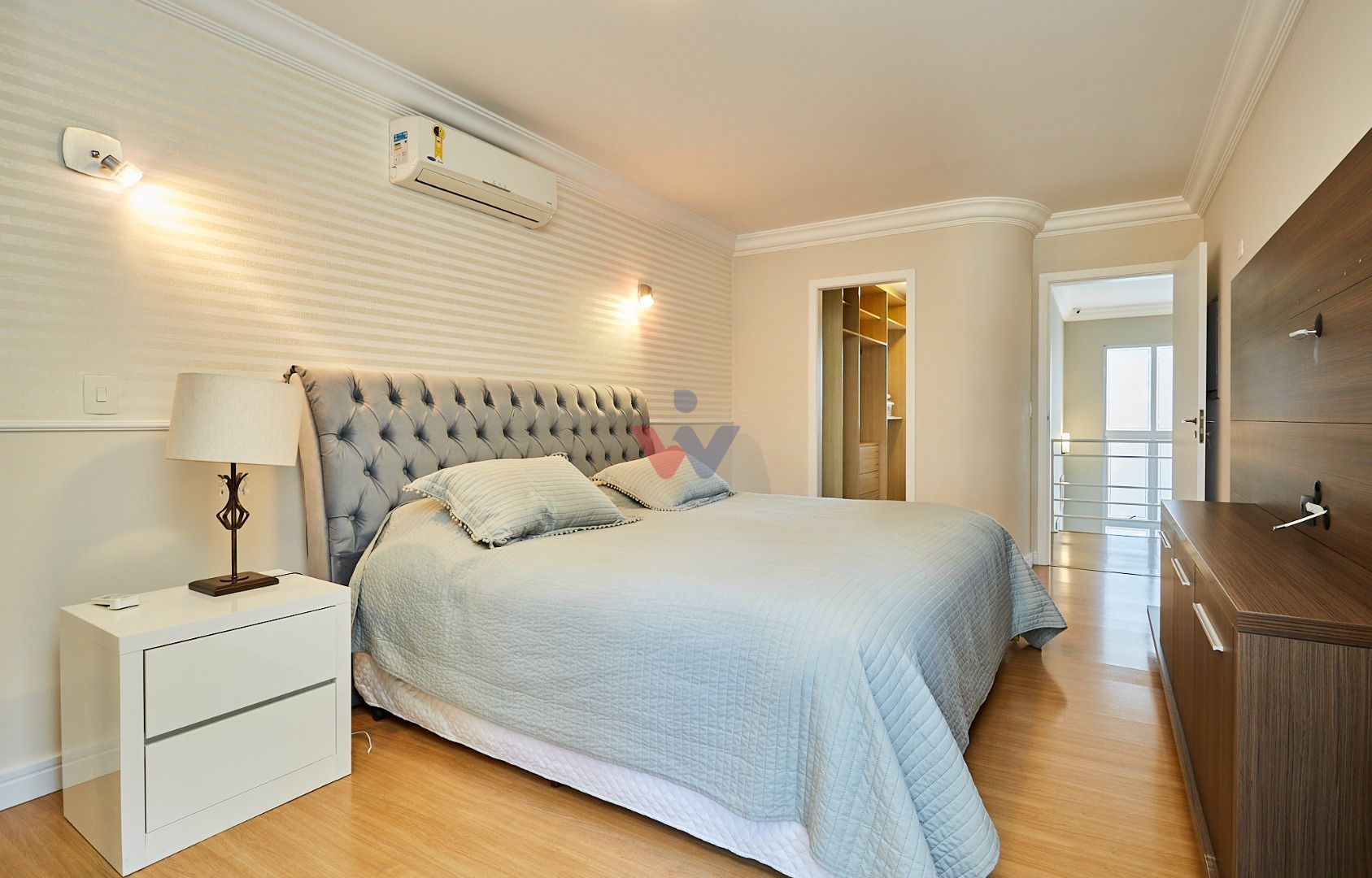 Suíte master exclusiva: amplo closet, banheiro com hidromassagem e bancada com cubas duplas.