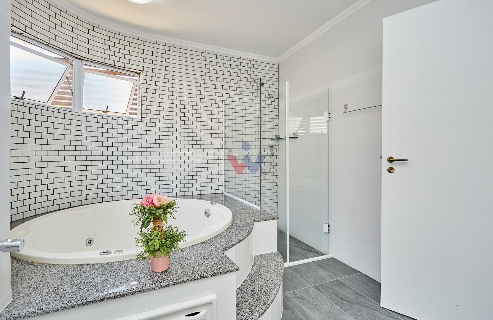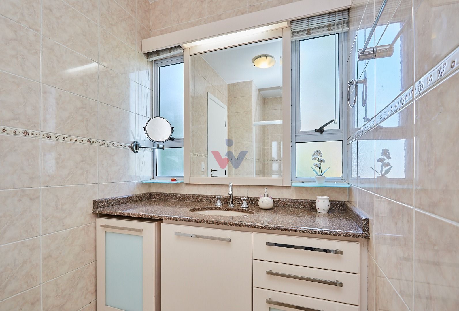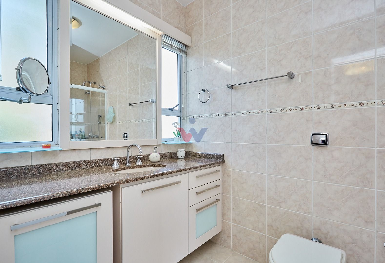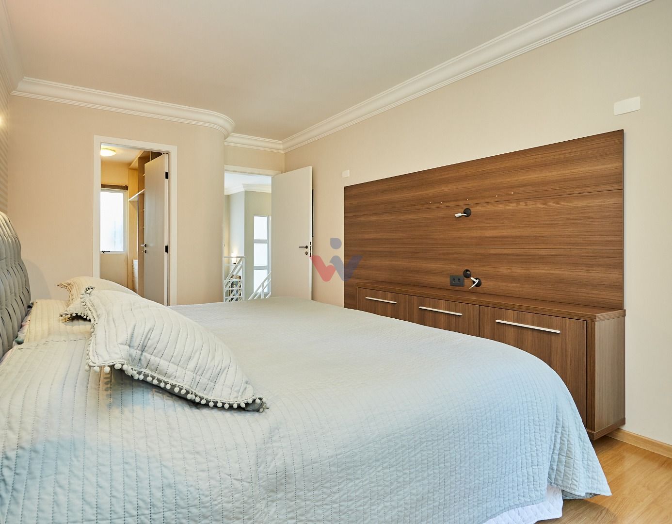 Suíte master exclusiva: amplo closet, banheiro com hidromassagem e bancada com cubas duplas.