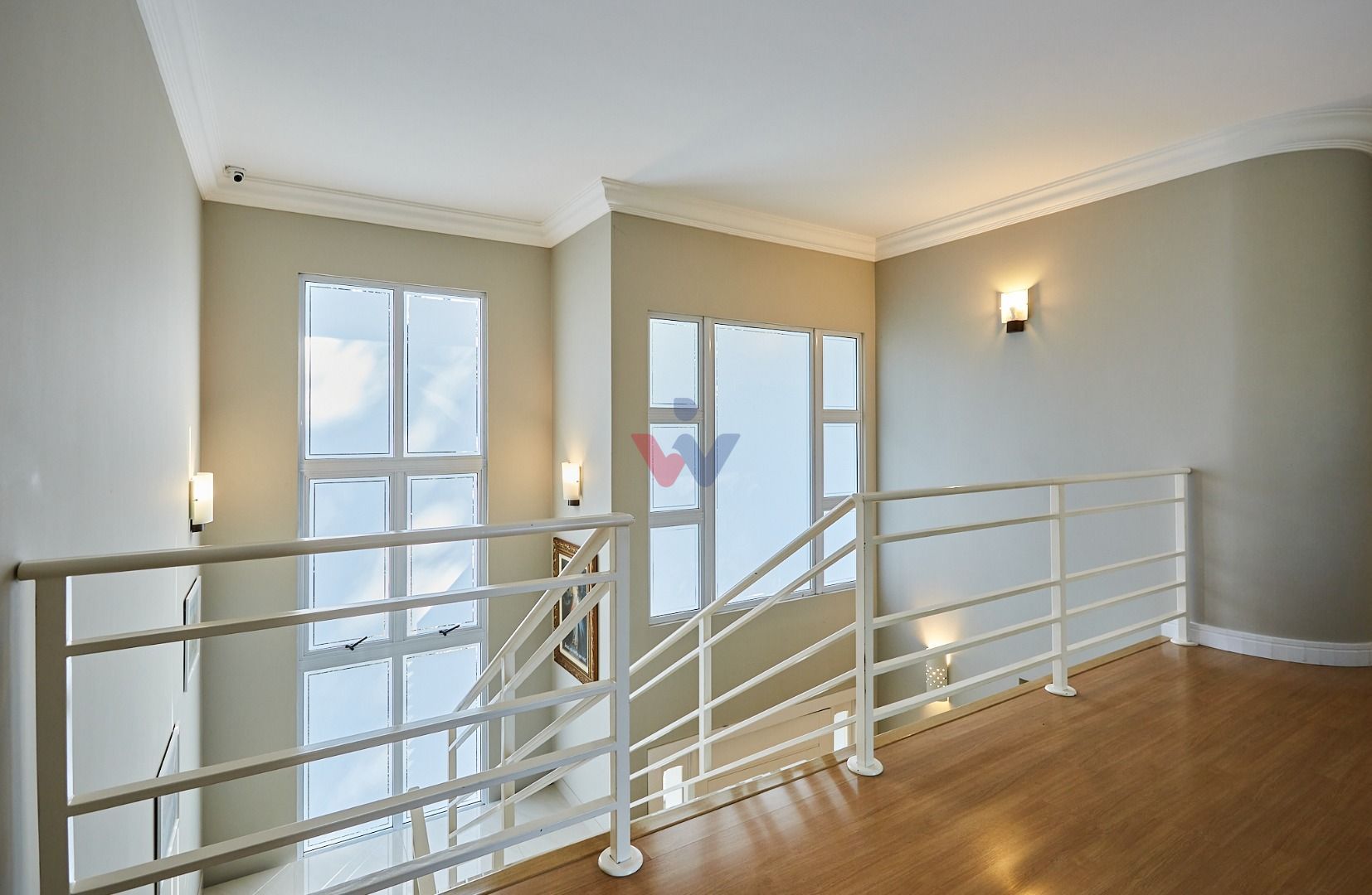 Pavimento superior sofisticado: mezanino multifuncional, home office com vista panorâmica e três suítes com sacada.