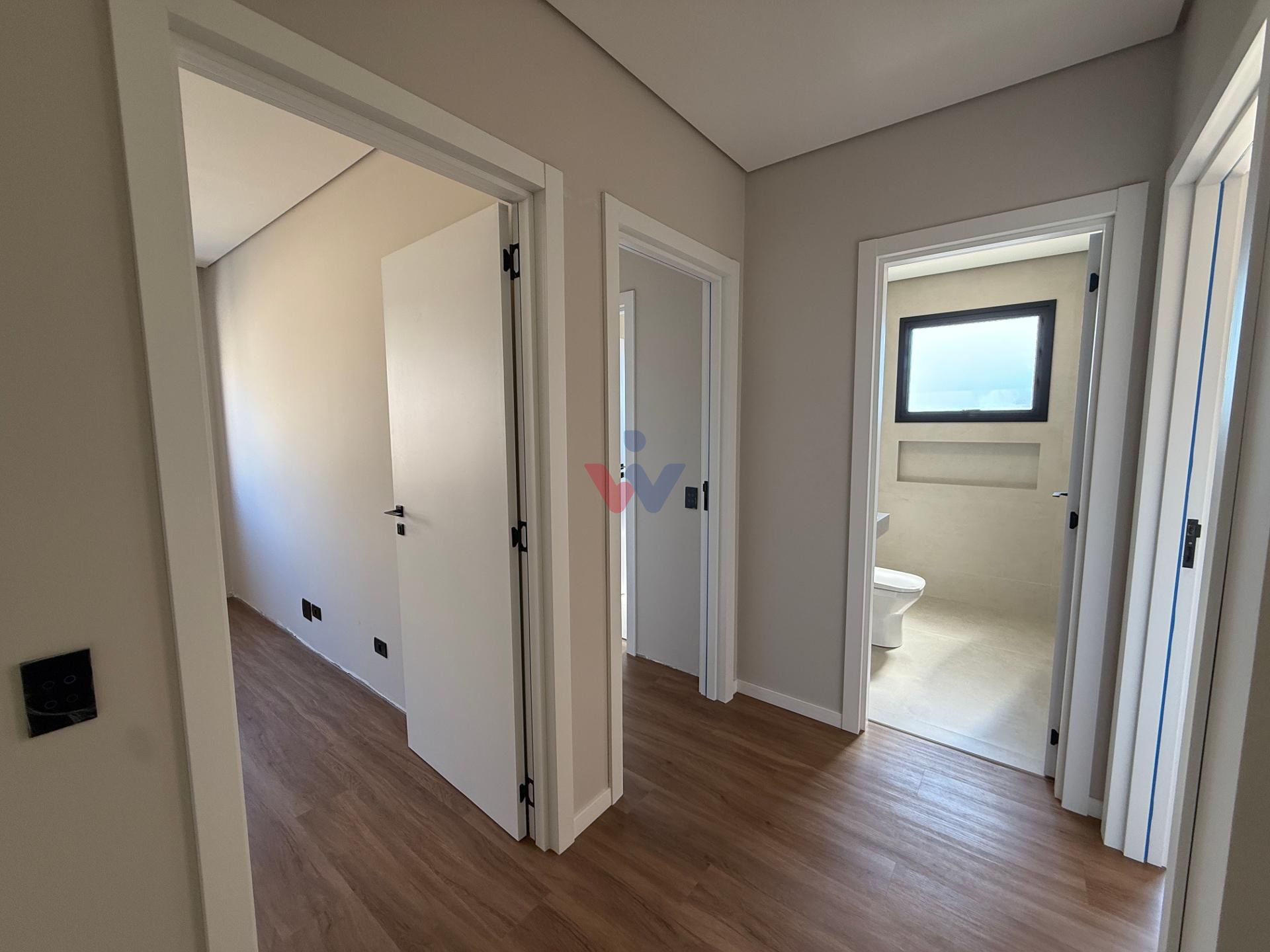 Um banheiro social adicional e um grande espaço para rouparia ou até mesmo um home office no corredor.