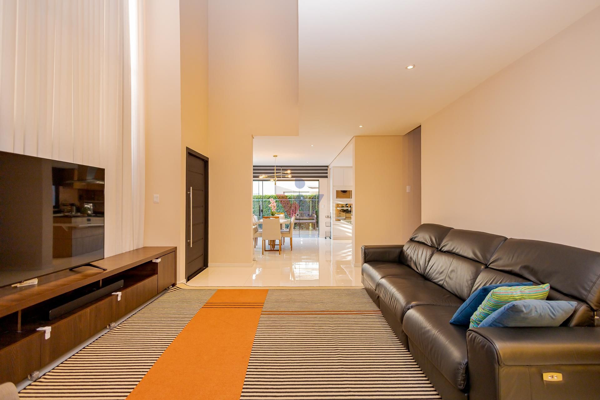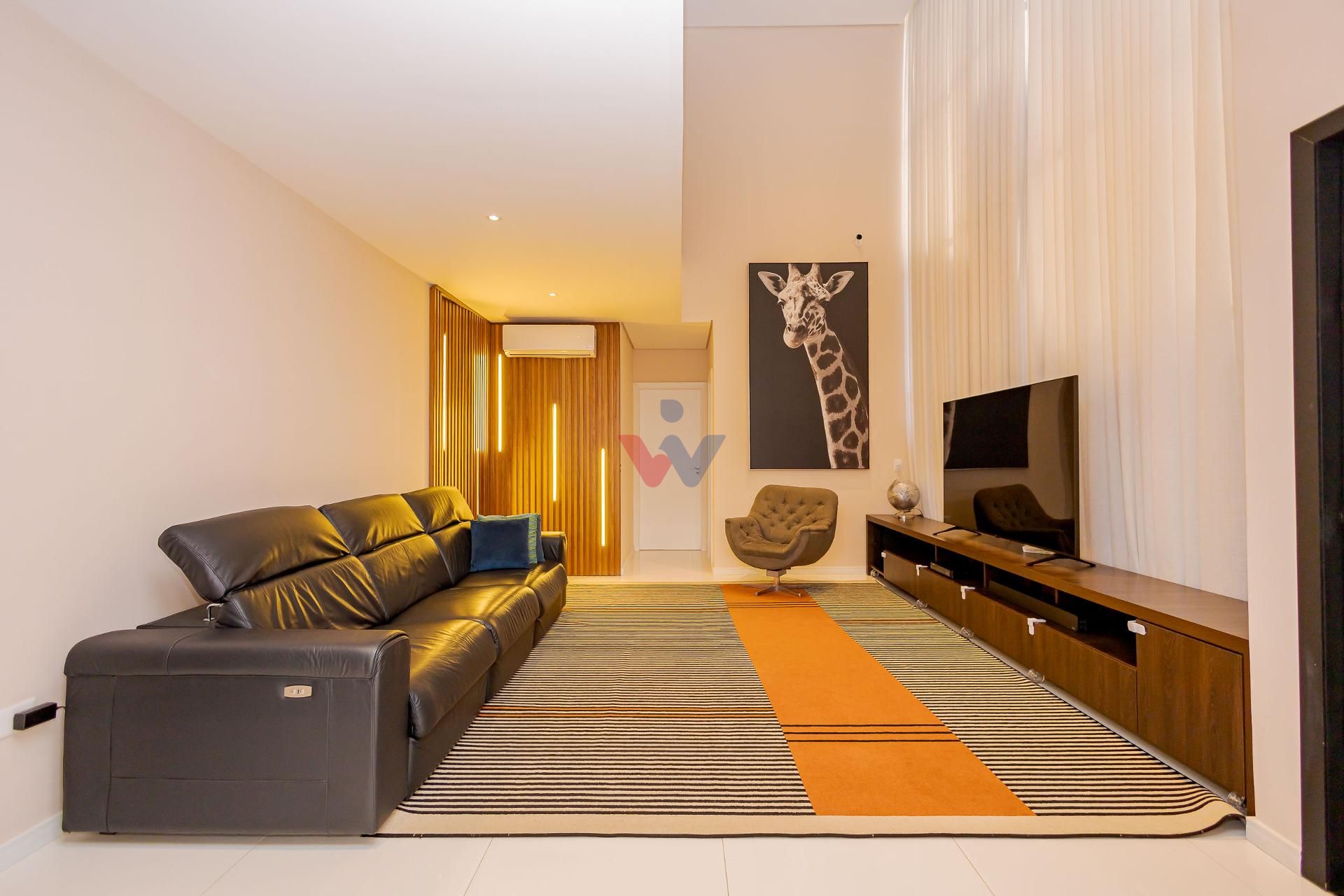 * No piso térreo a sala com pé direito duplo e um mezanino que garante excelente iluminação natural