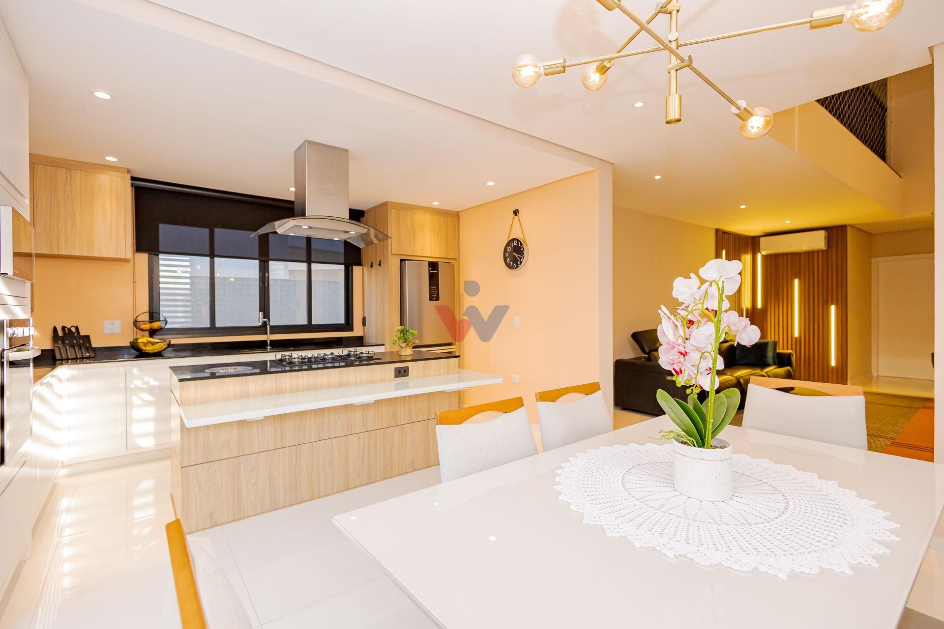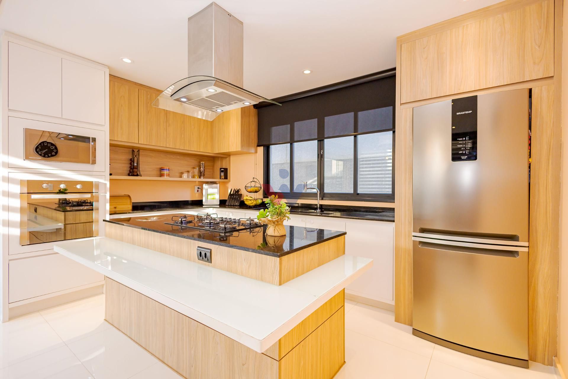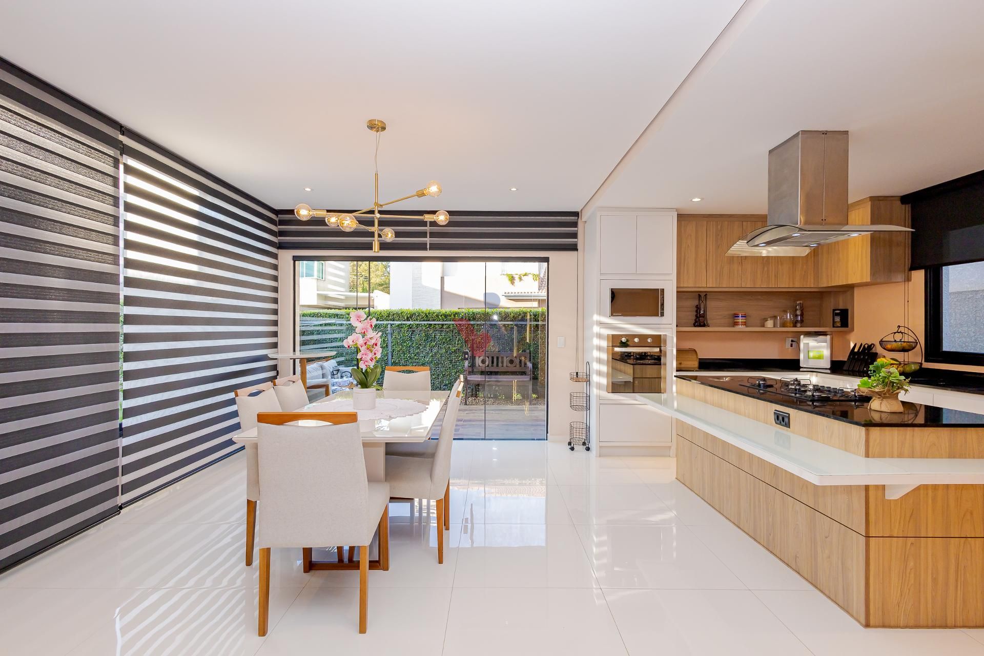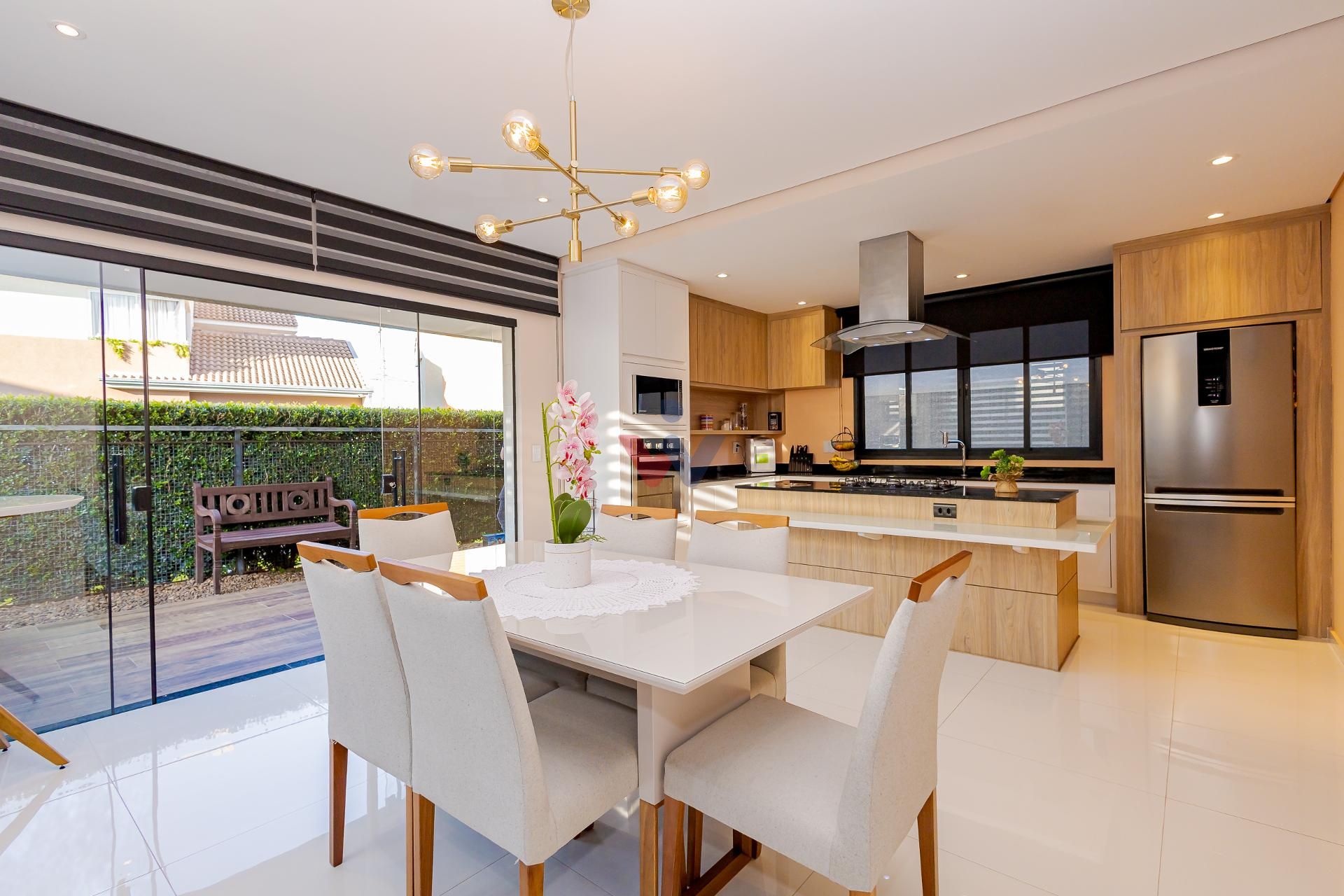 * A área da cozinha em conceito aberto com ilha, conta com acesso à varanda gourmet integrada à sala de jantar