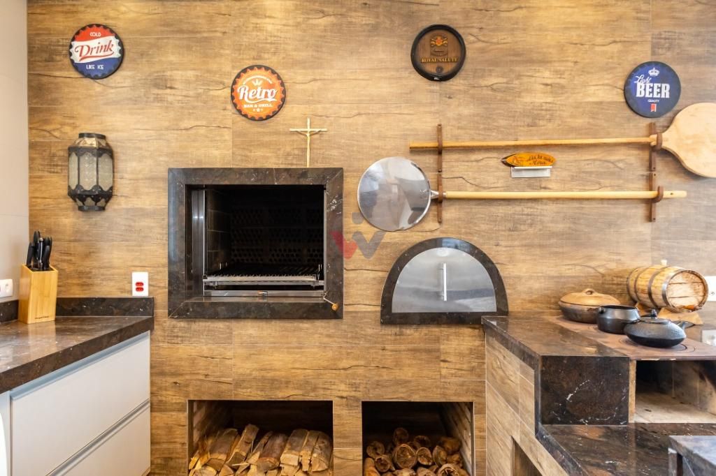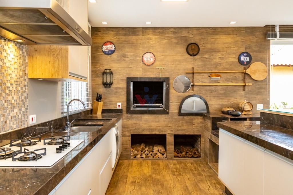 - Churrasqueira; Forno a lenha;- Fogão á lenha;- Ilha para refeições;