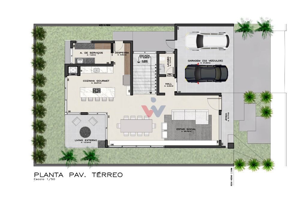 PAVIMENTO TÉRREO: Átrio, hall de entrada, amplas salas de estar com mezanino (pé direito duplo) e sala jantar, living externo, lavabo, despensa, cozinha gourmet (c/ churrasqueira), área de serviço, depósito/despensa. Garagem: vagas cobertas (2 carros).
