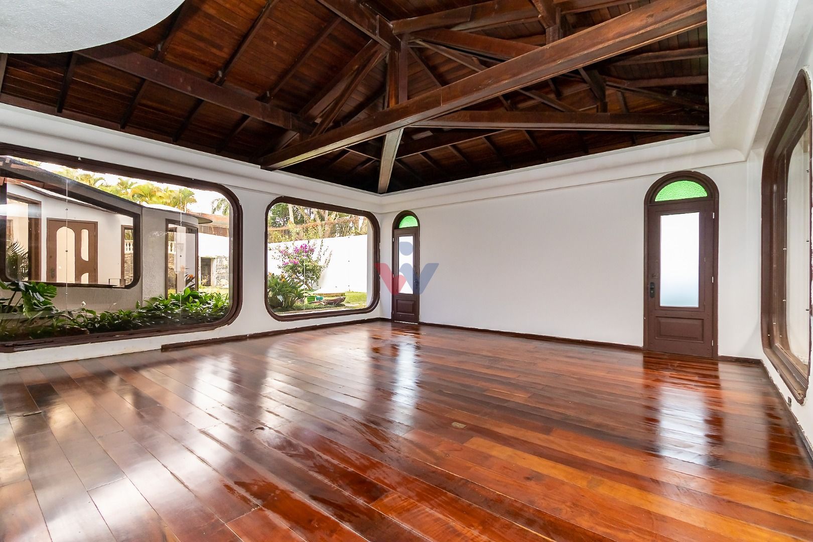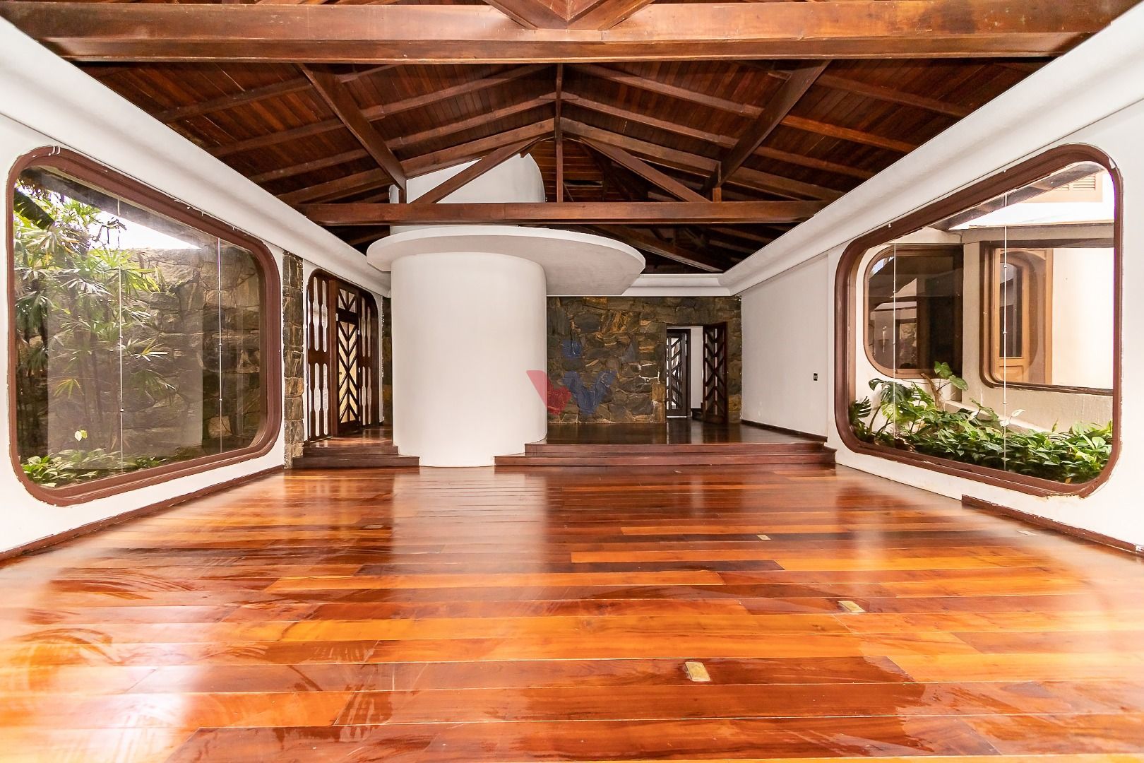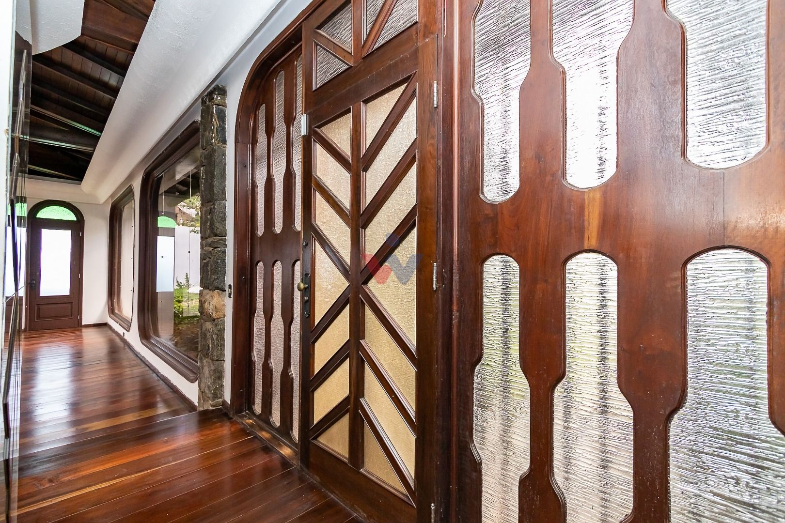 Venezianas em madeira, pisos em madeira natural nas áreas sociais e íntimas, pisos decorados nas áreas frias, pias em madeira ornamental, forro com ripamento em madeira de lei, paredes com pedras naturais e jardim exuberante, que valorizam o estilo clássico e sofisticado do imóvel.