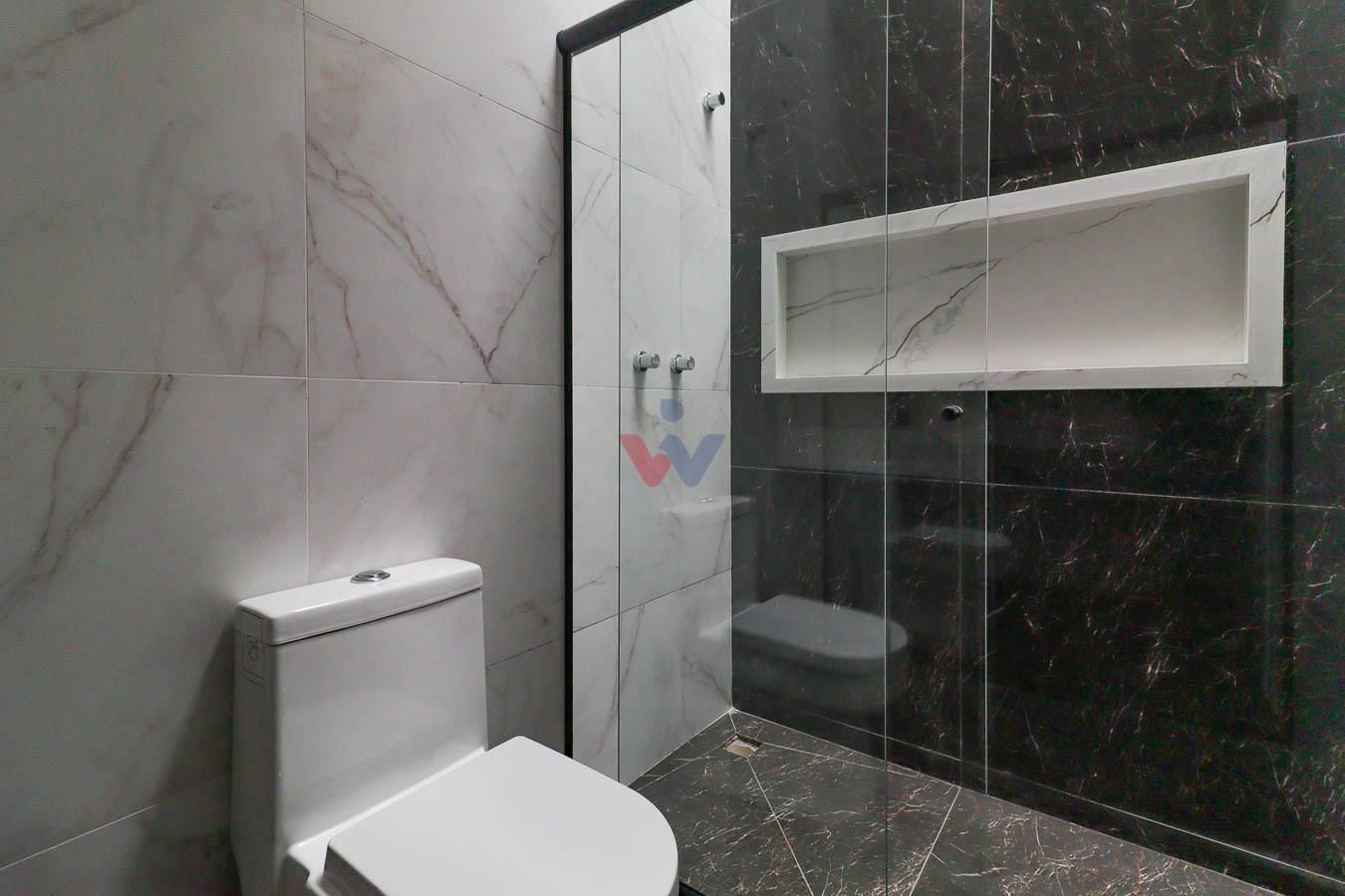 - 3 Quartos (1 Suíte): Banheiro da suíte com pia dupla esculpida em porcelanato, nicho grande e box.