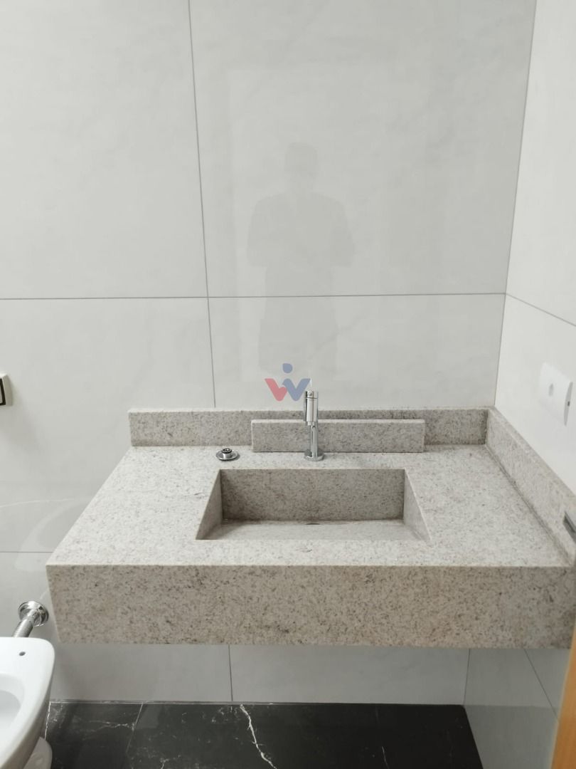 Banheiro social: Com nicho embutido e lavatório esculpido em porcelanato fino.