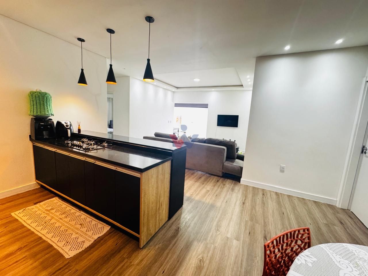 A área social é um convite à convivência: sala e cozinha em conceito aberto, com excelente aproveitamento de espaço e acabamento refinado. As portas de correr em vidro fumê em toda a fachada frontal ampliam a sensação de liberdade e integram o ambiente à área externa - perfeita para receber.