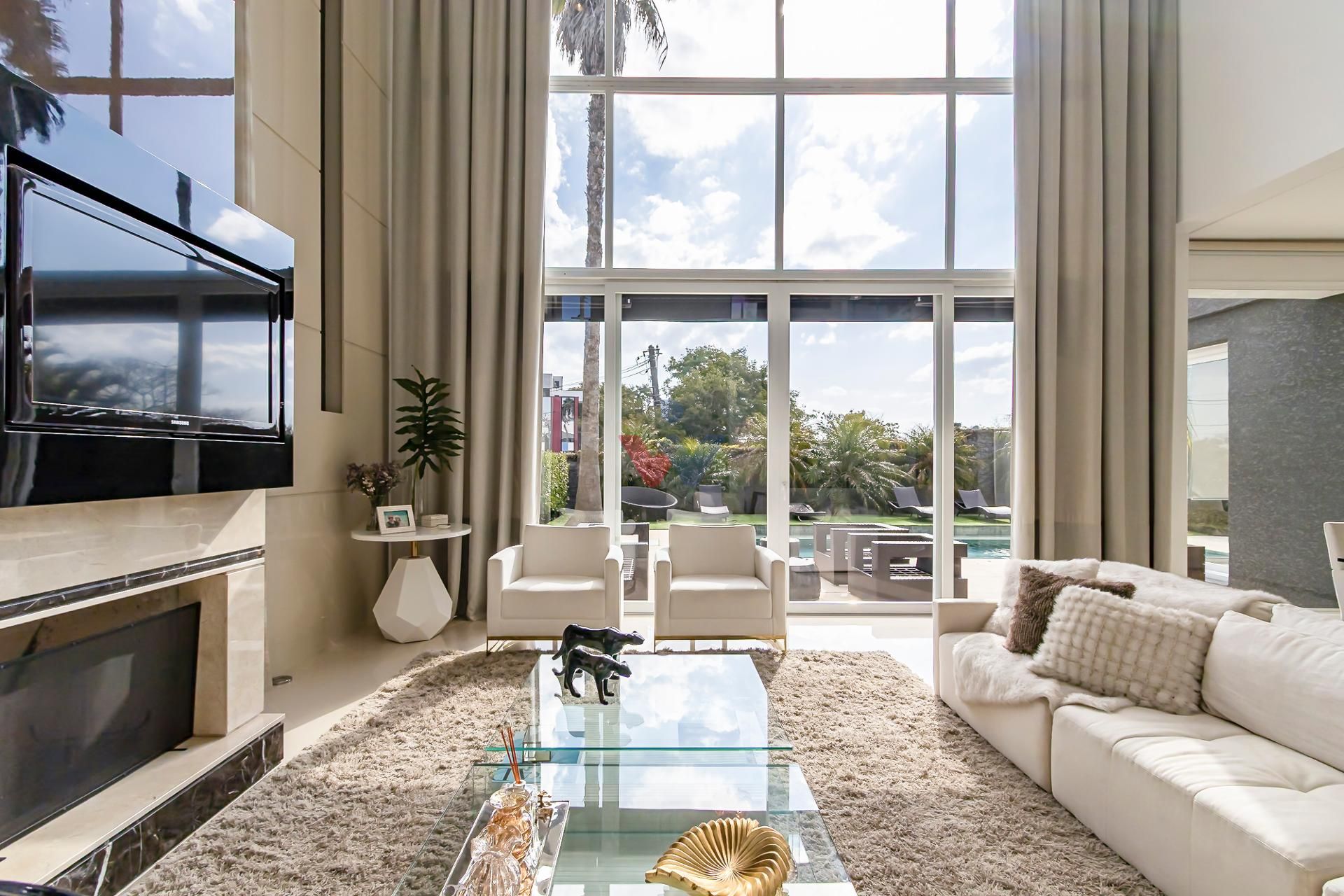 - Sala de estar e jantar integradas, com pé-direito duplo