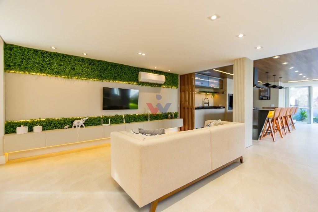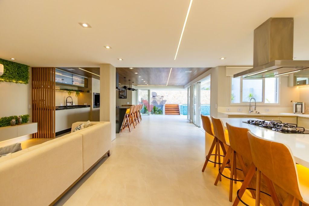 Living, sala de jantar, área gourmet e cozinha conectados ao jardim gramado
