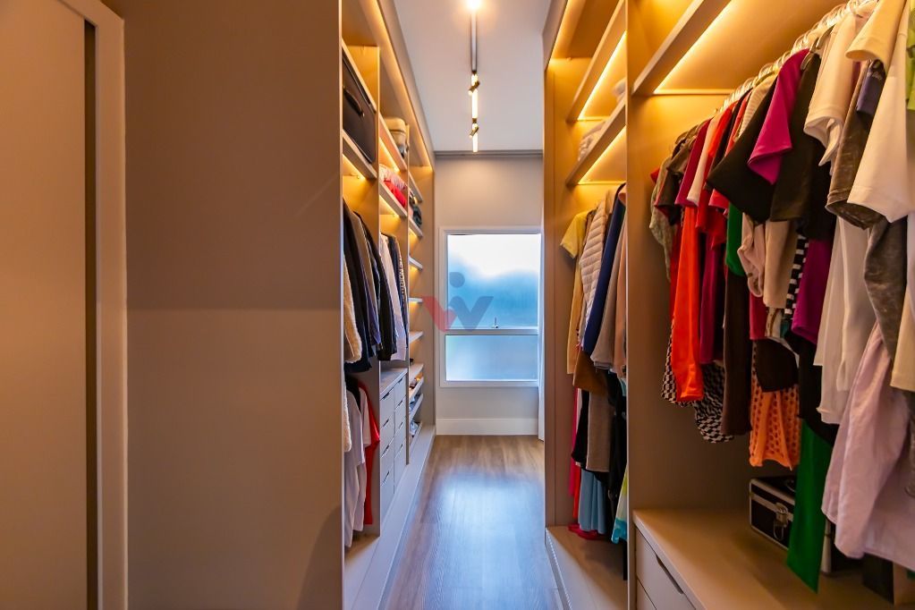 Suíte máster com closet espaçoso e sacada com vista para a piscina