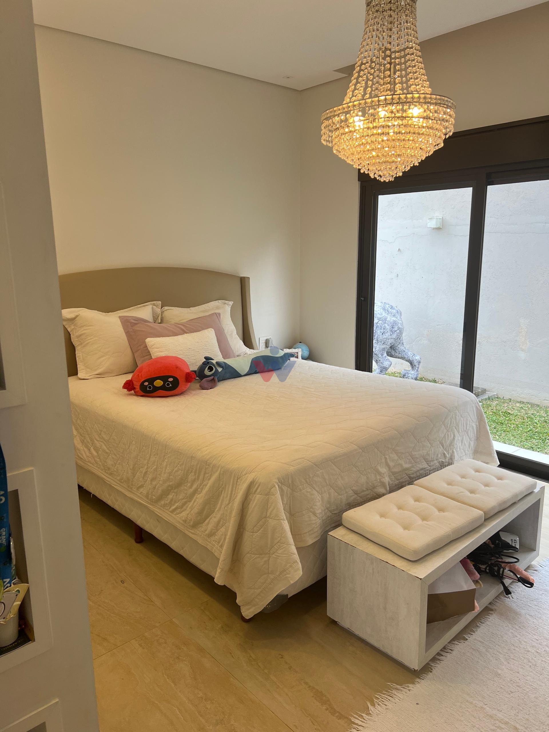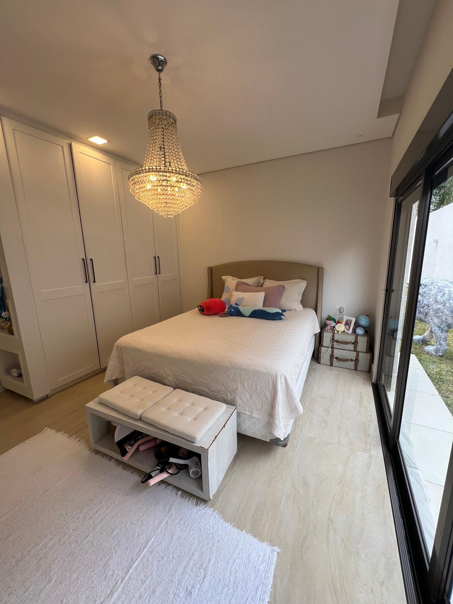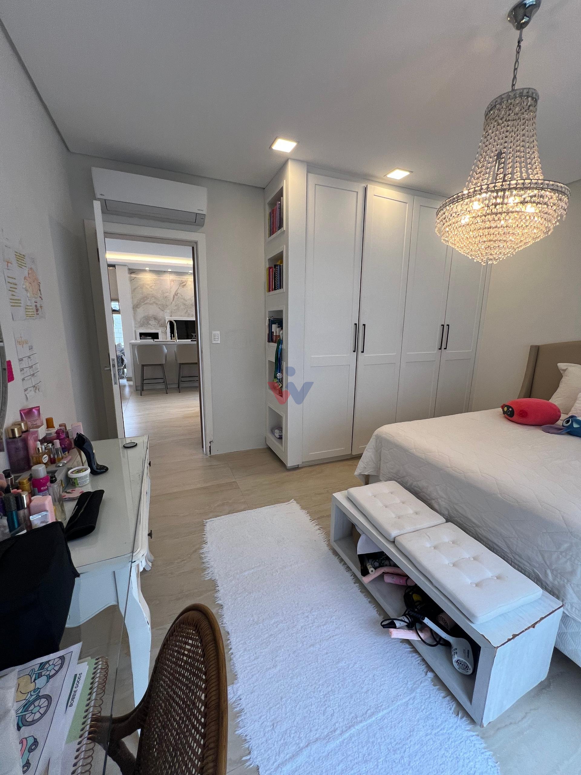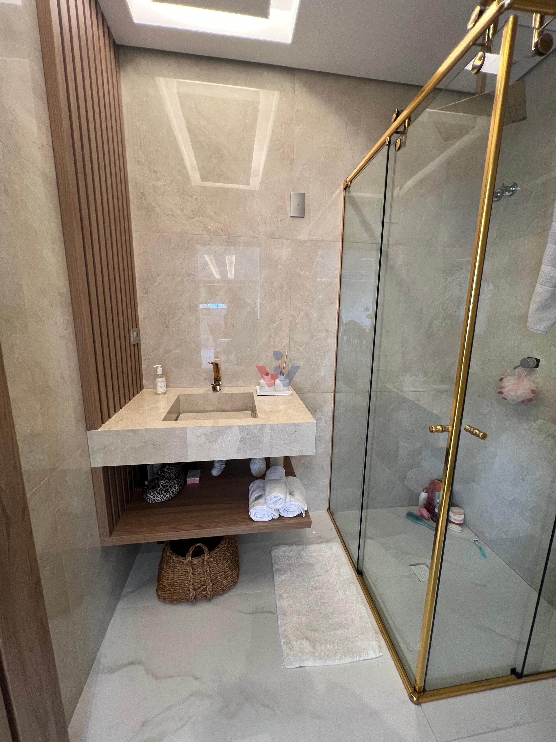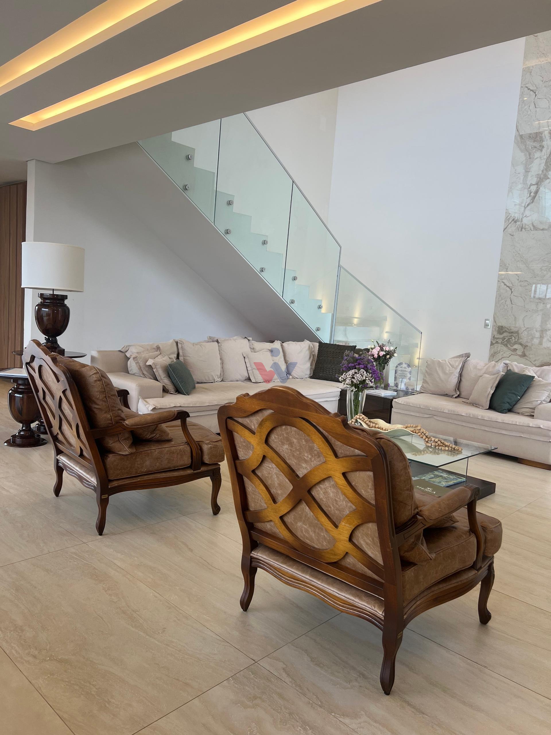 No piso superior, três suítes garantem o conforto da família. A suíte master oferece closet espaçoso, bancada com duas cubas e chuveiros duplos, compondo um refúgio de relaxamento e praticidade. Um mezanino, atualmente usado como sala íntima de TV, proporciona um espaço acolhedor e com vista aberta para o ambiente social.