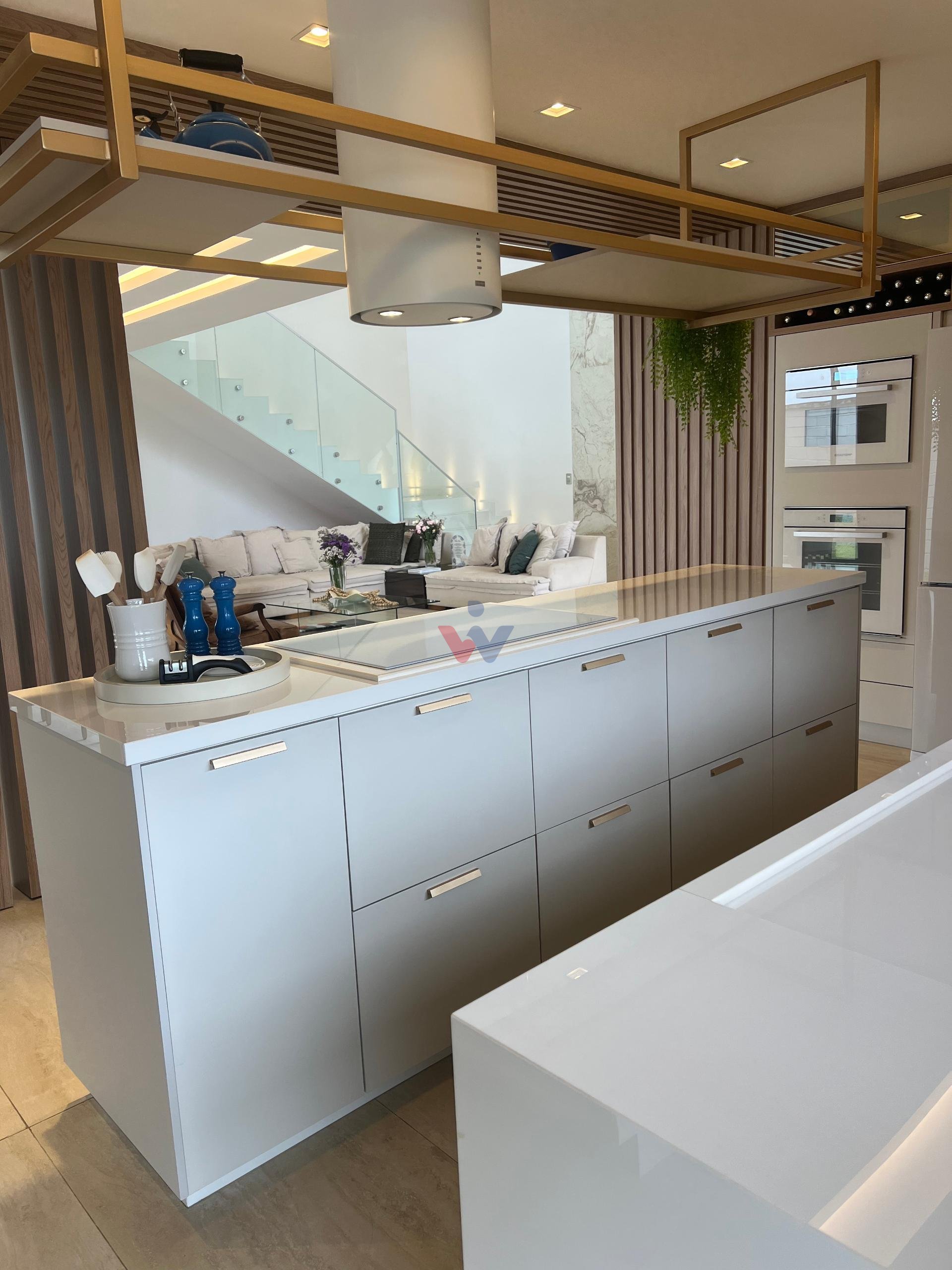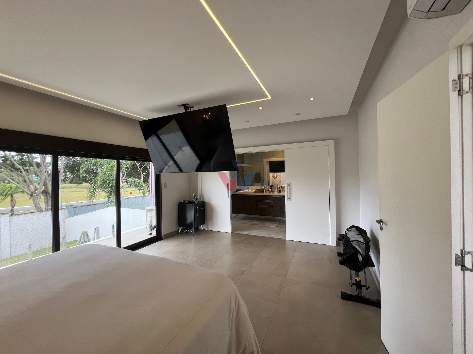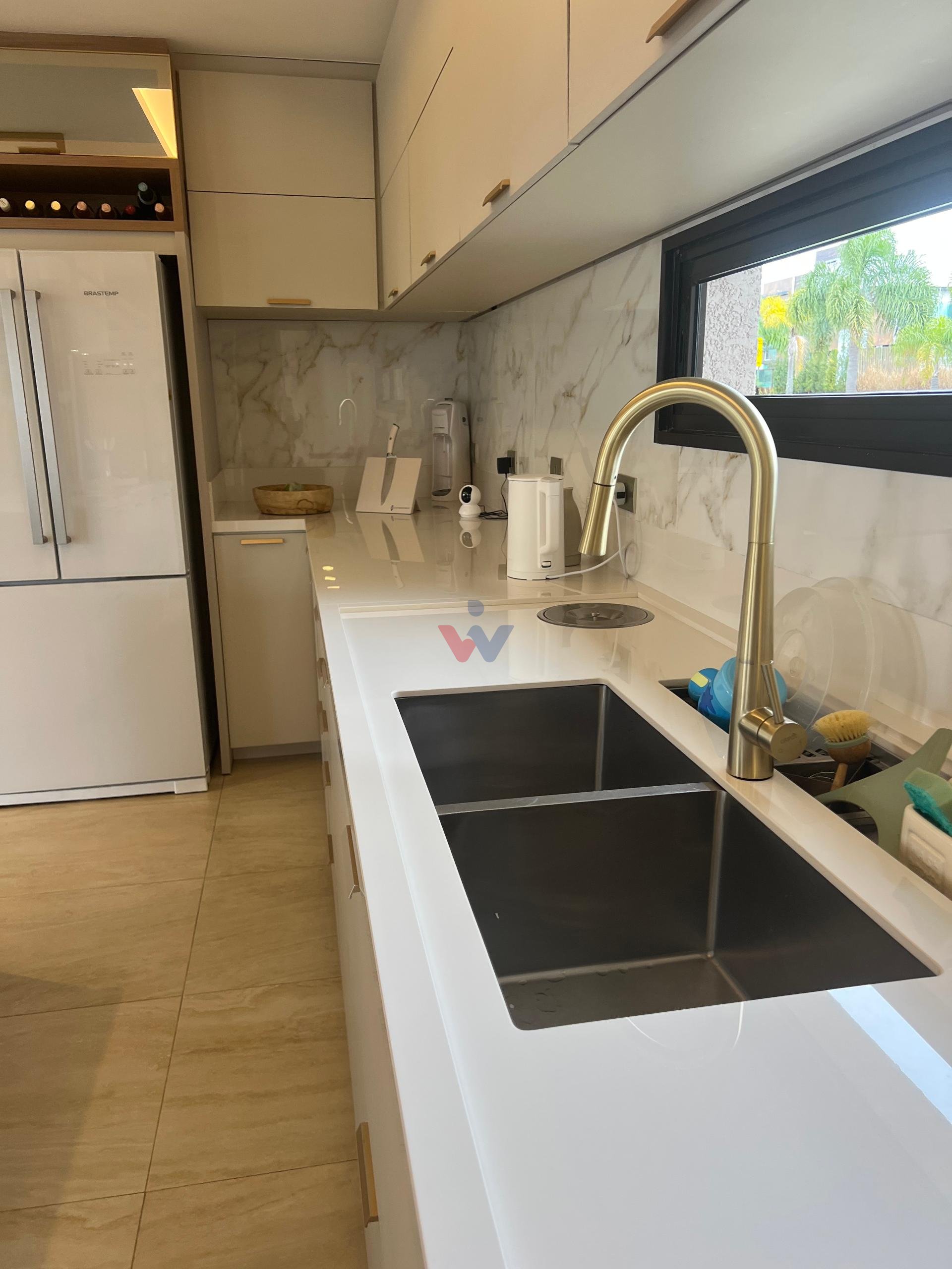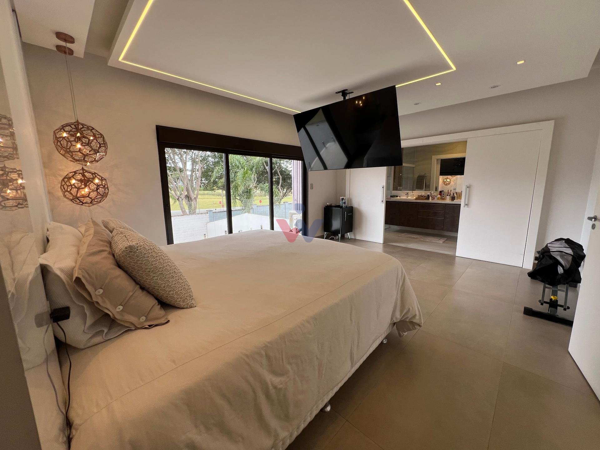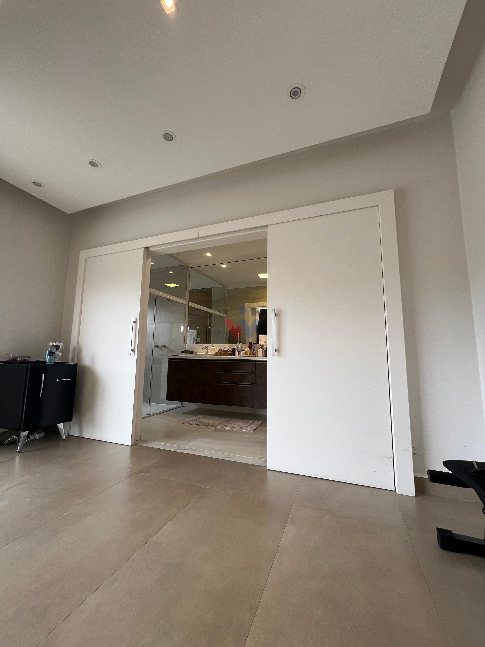 No piso superior, três suítes garantem o conforto da família. A suíte master oferece closet espaçoso, bancada com duas cubas e chuveiros duplos, compondo um refúgio de relaxamento e praticidade. Um mezanino, atualmente usado como sala íntima de TV, proporciona um espaço acolhedor e com vista aberta para o ambiente social.