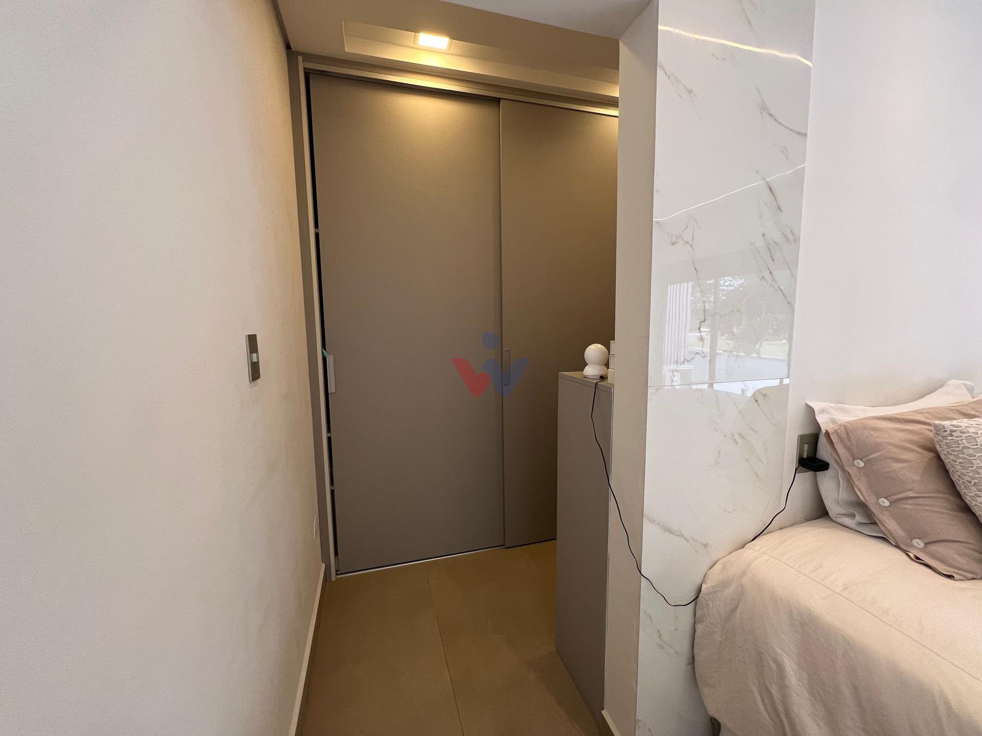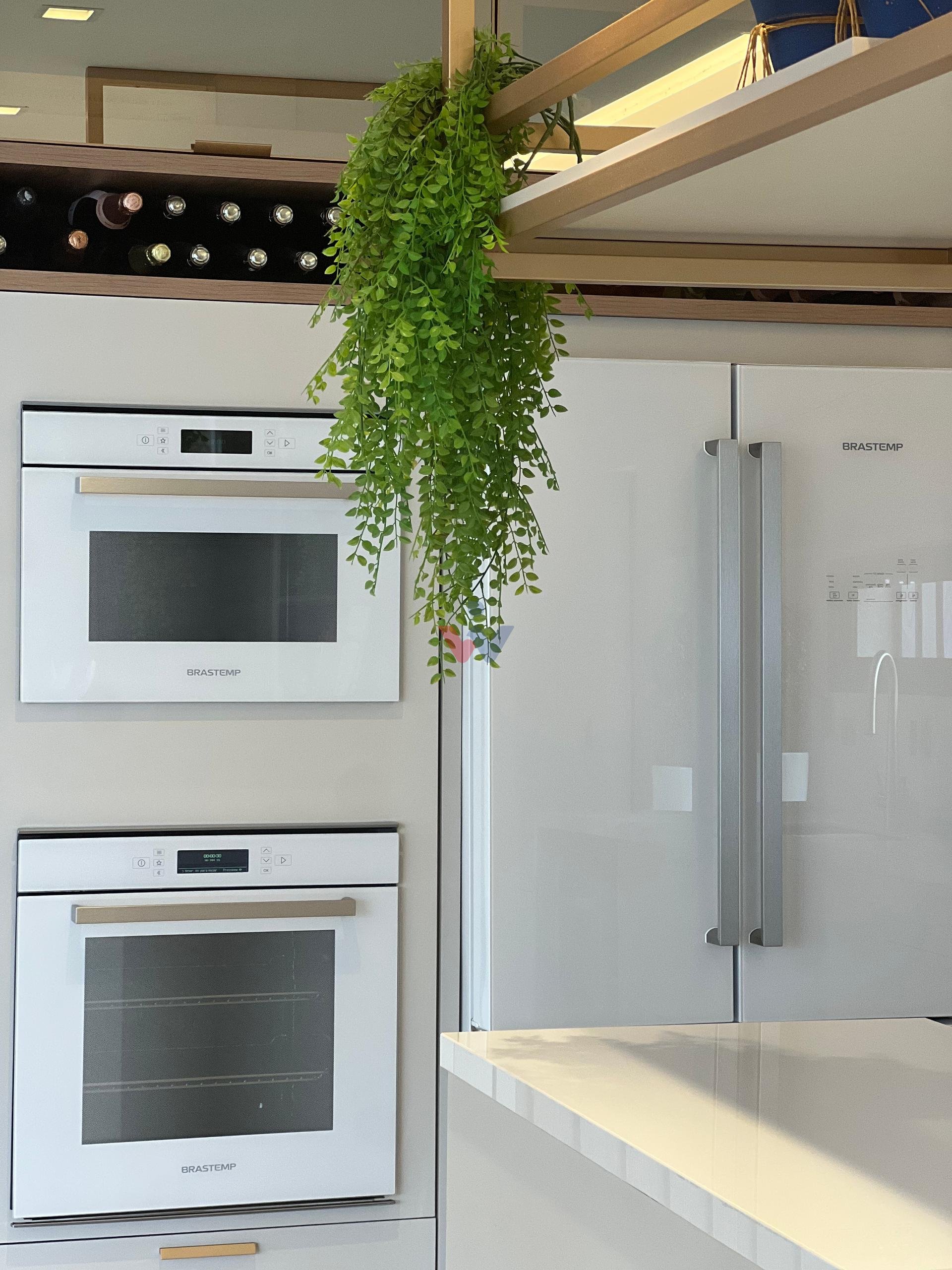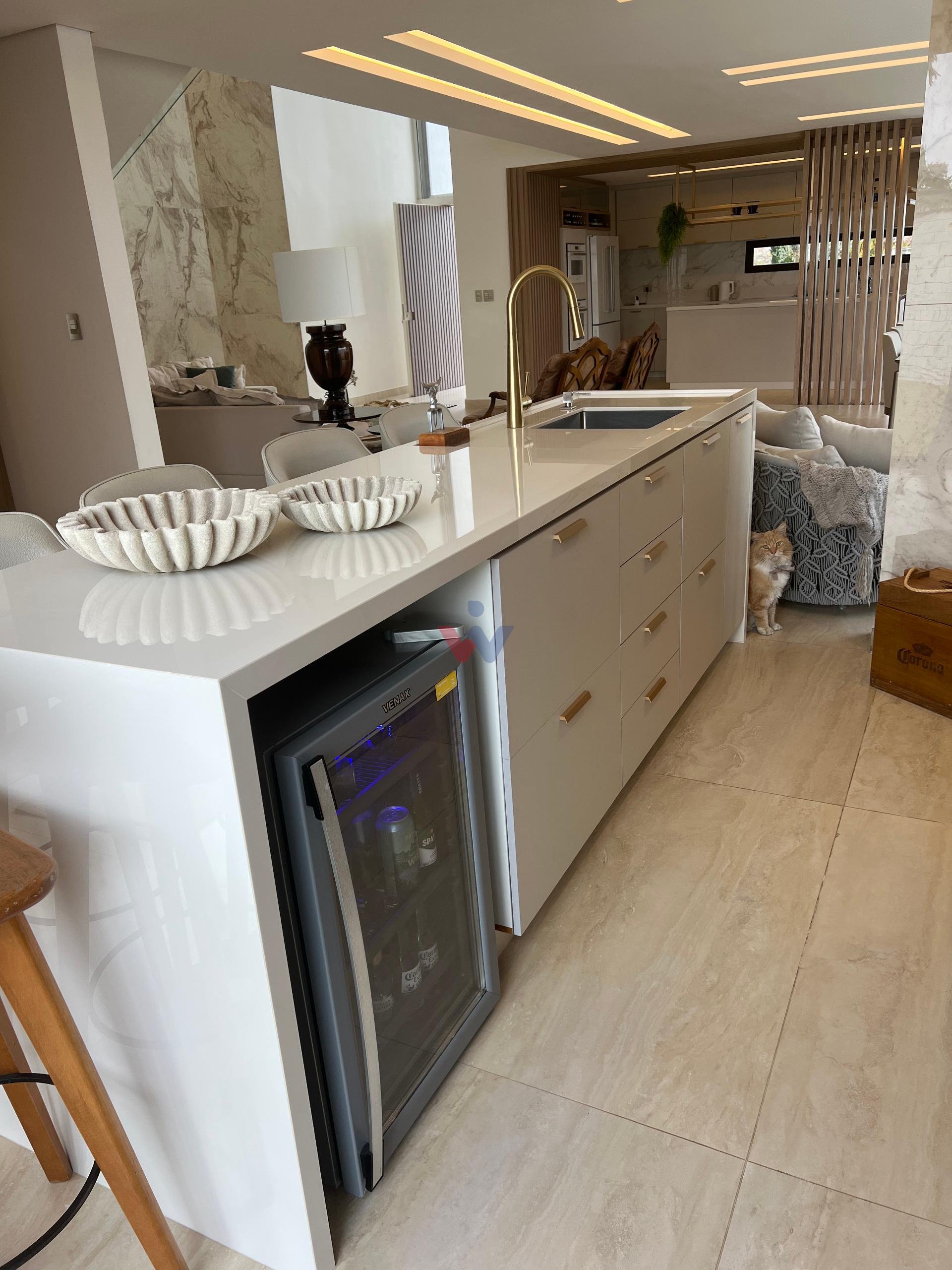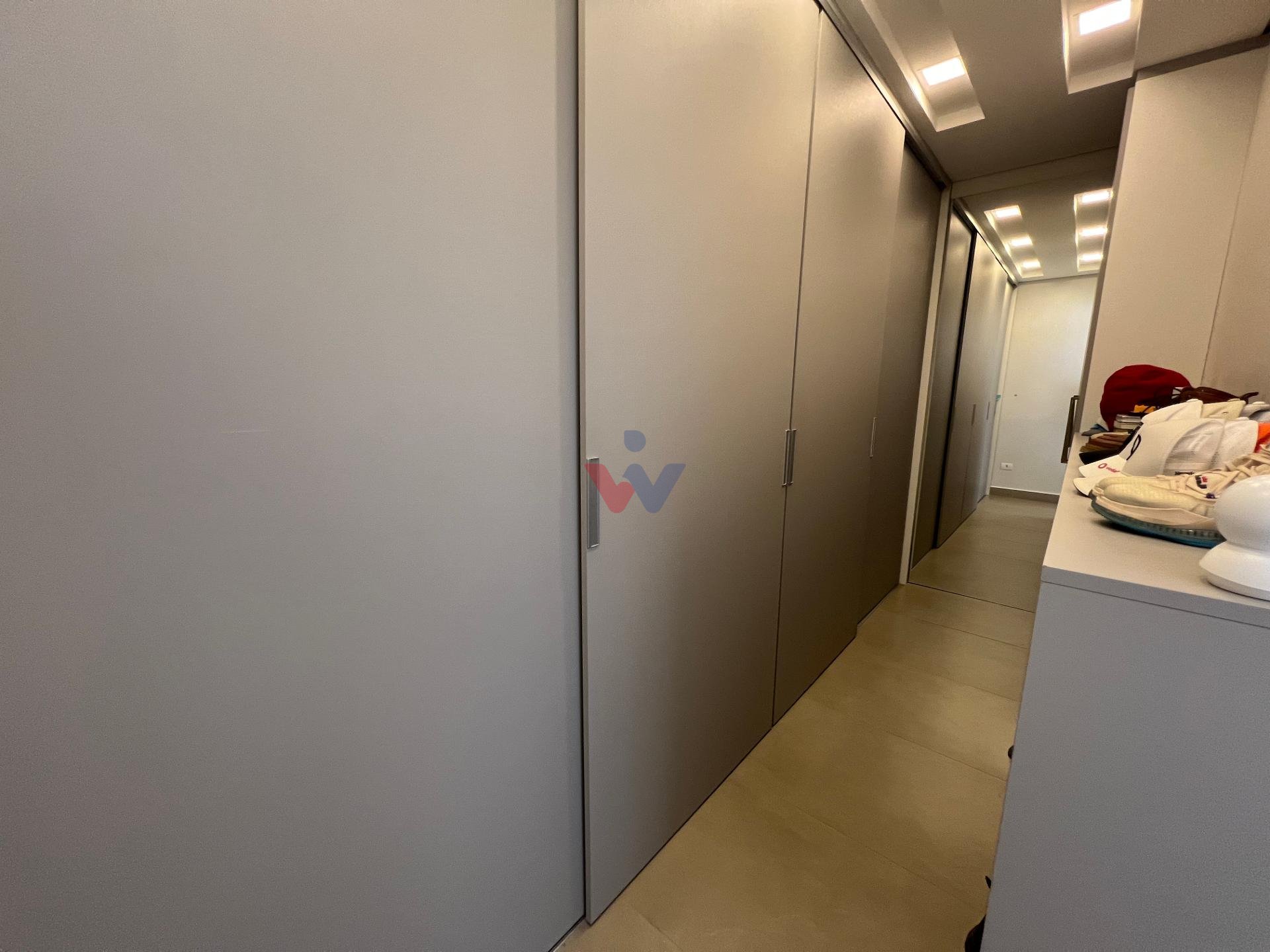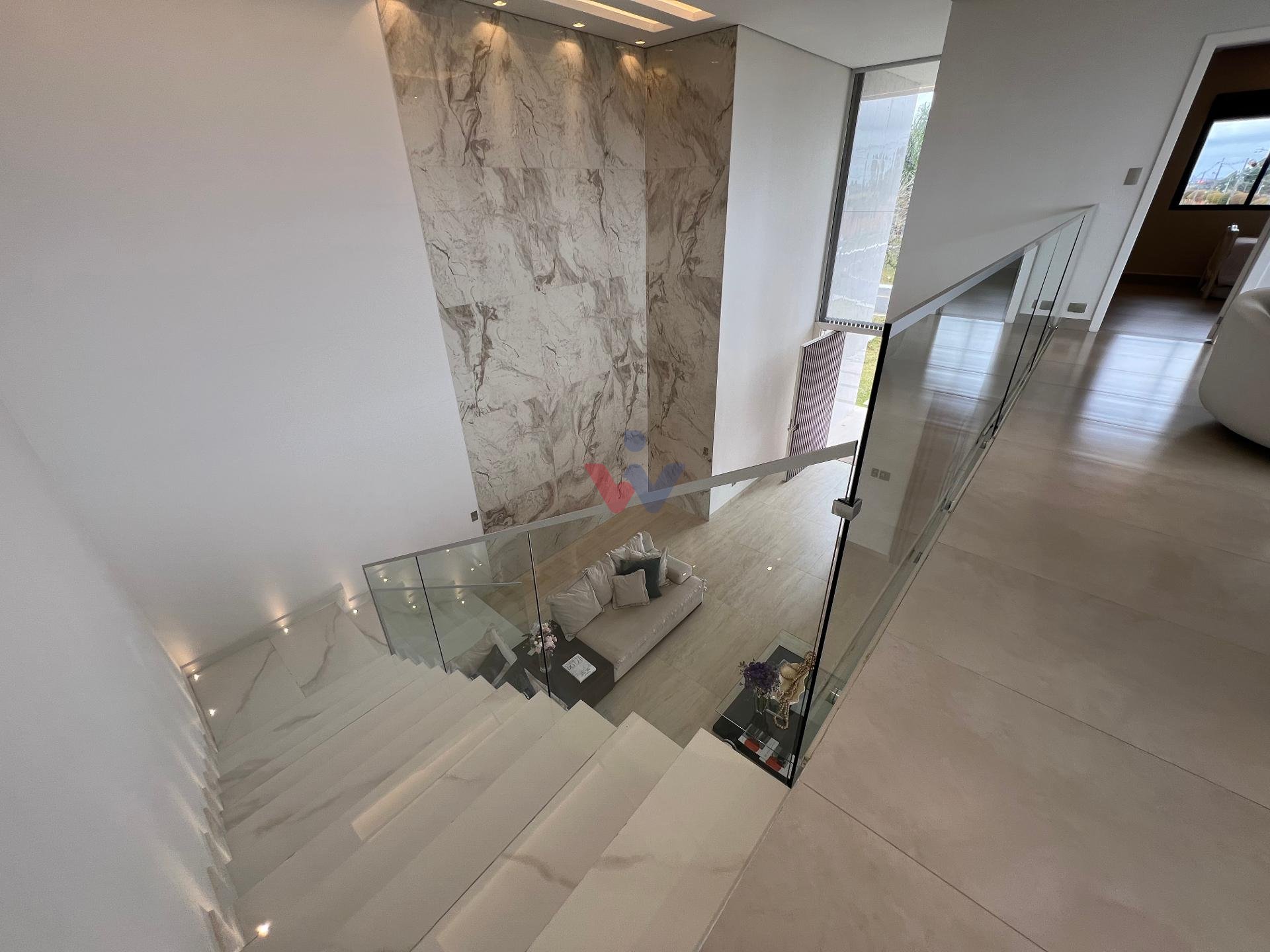 No piso superior, três suítes garantem o conforto da família. A suíte master oferece closet espaçoso, bancada com duas cubas e chuveiros duplos, compondo um refúgio de relaxamento e praticidade. Um mezanino, atualmente usado como sala íntima de TV, proporciona um espaço acolhedor e com vista aberta para o ambiente social.