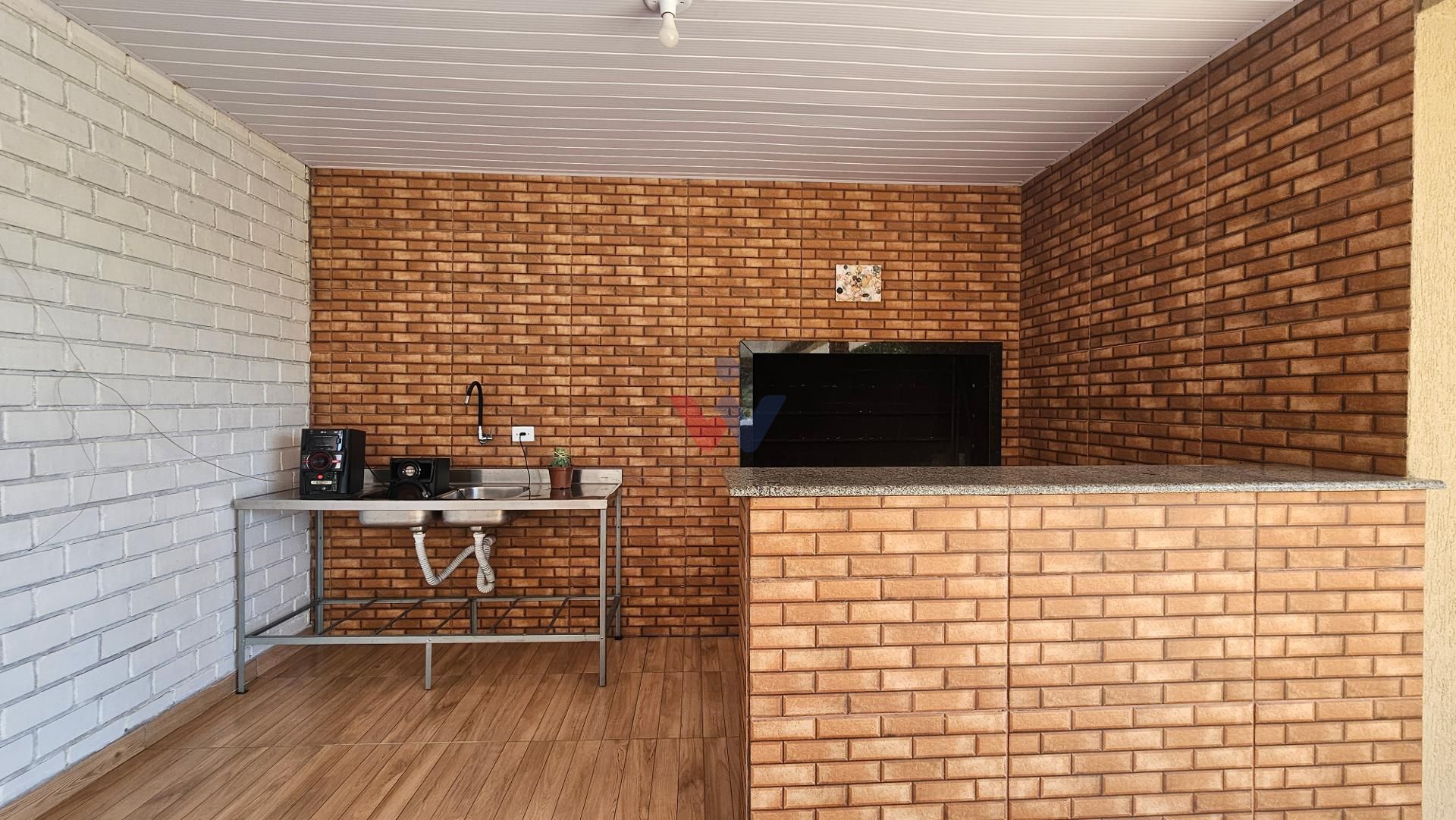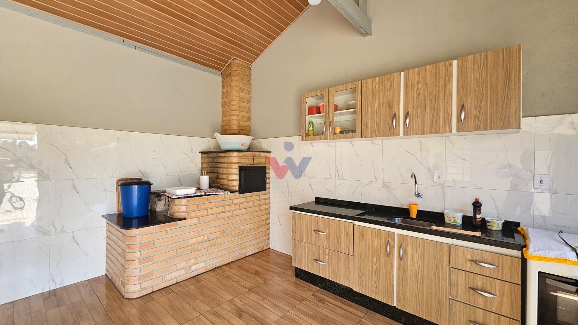 Cozinha caipira equipada com churrasqueira, fogão a lenha e forno