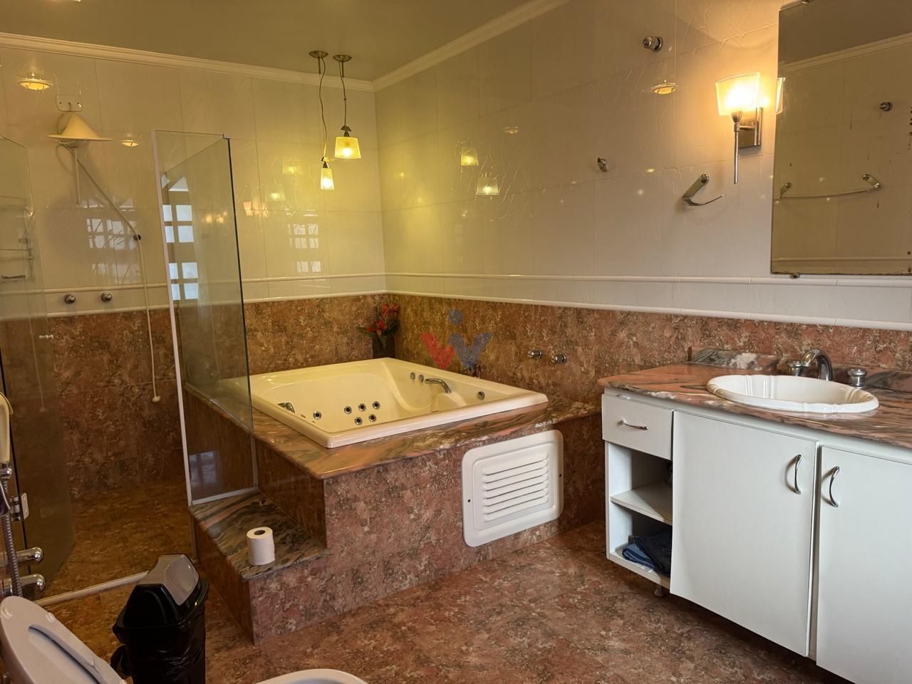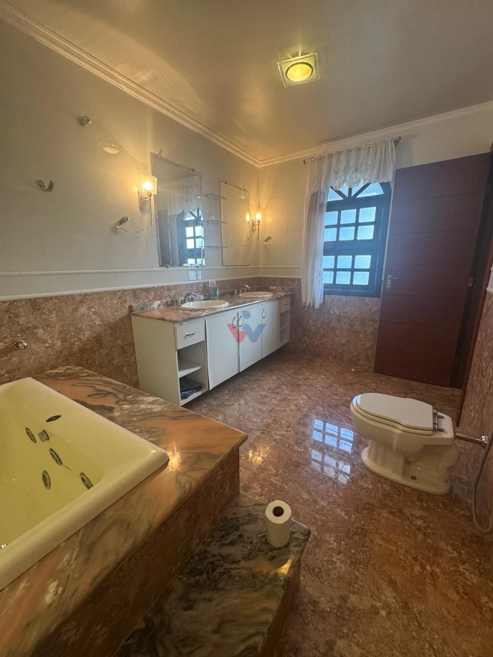 Banheiro da suíte com banheira de hidromassagem, acabamento refinado em mármore e excelente iluminação natural