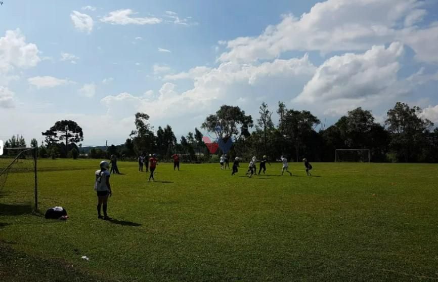 Quadra esportiva coberta e campo de futebol