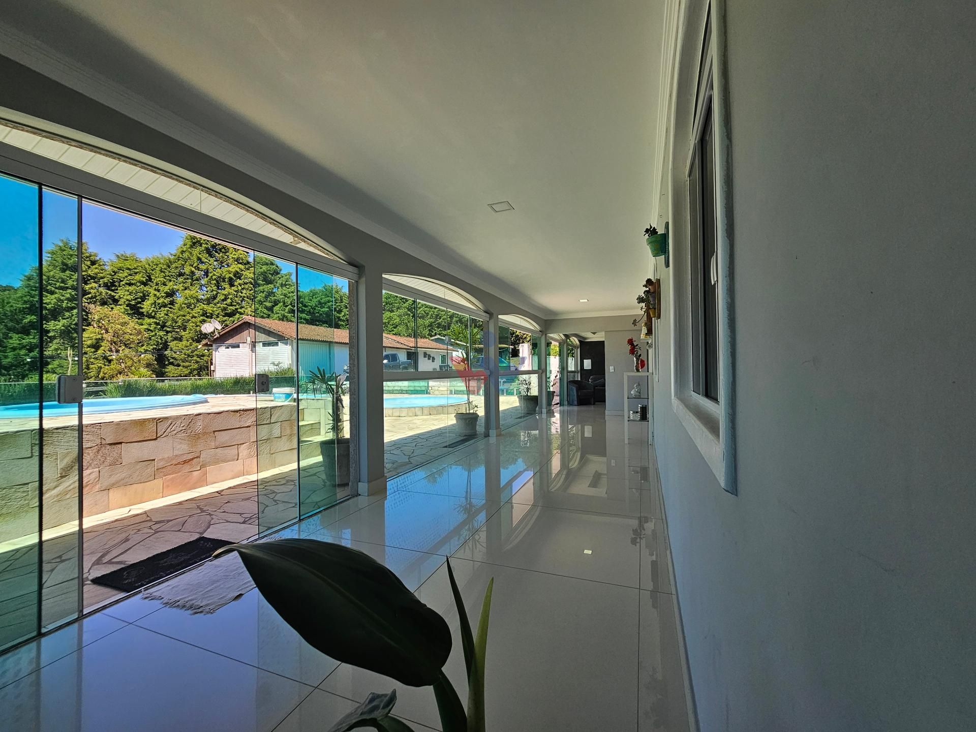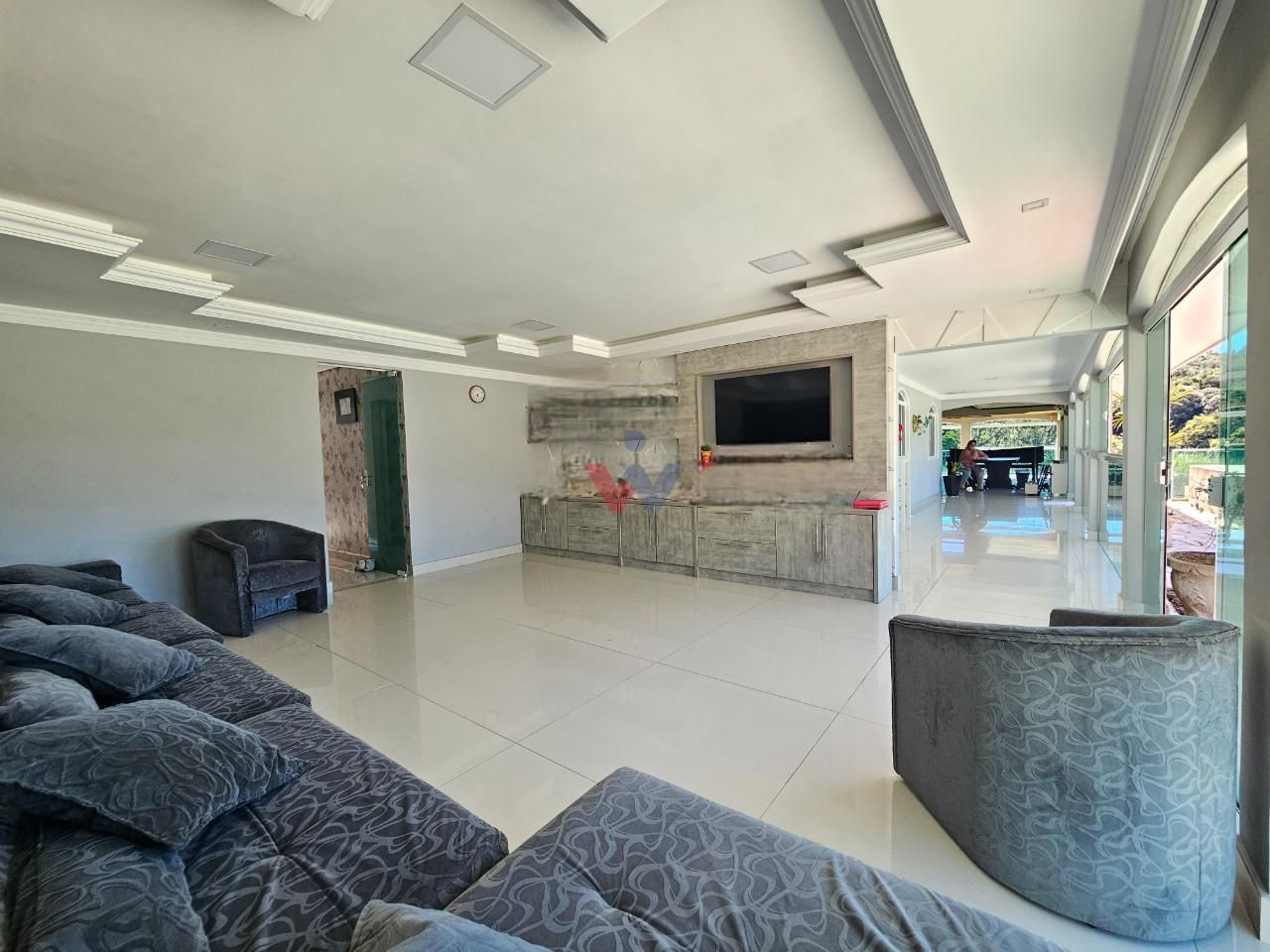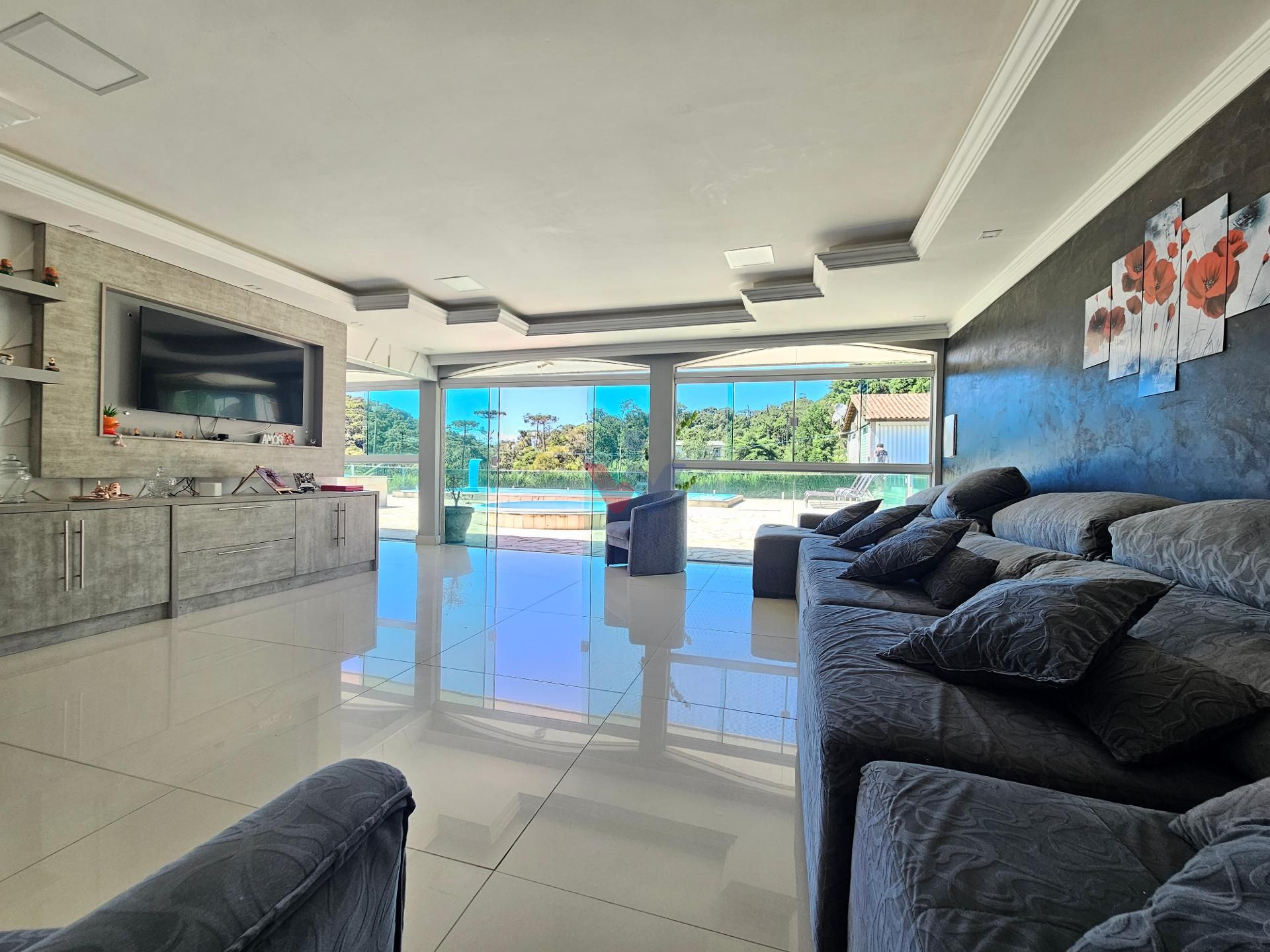 Grande sala de estar com vista para a piscina