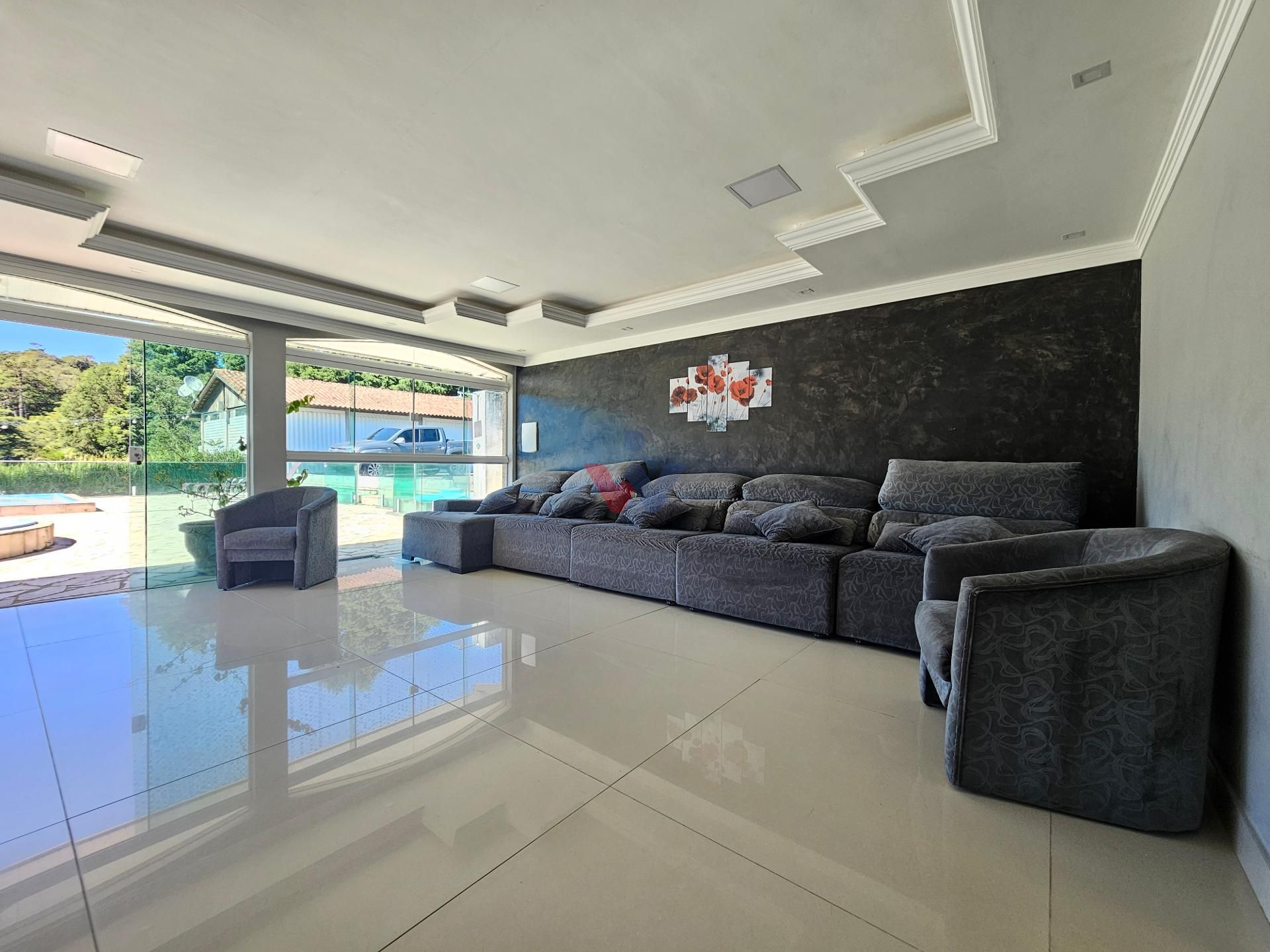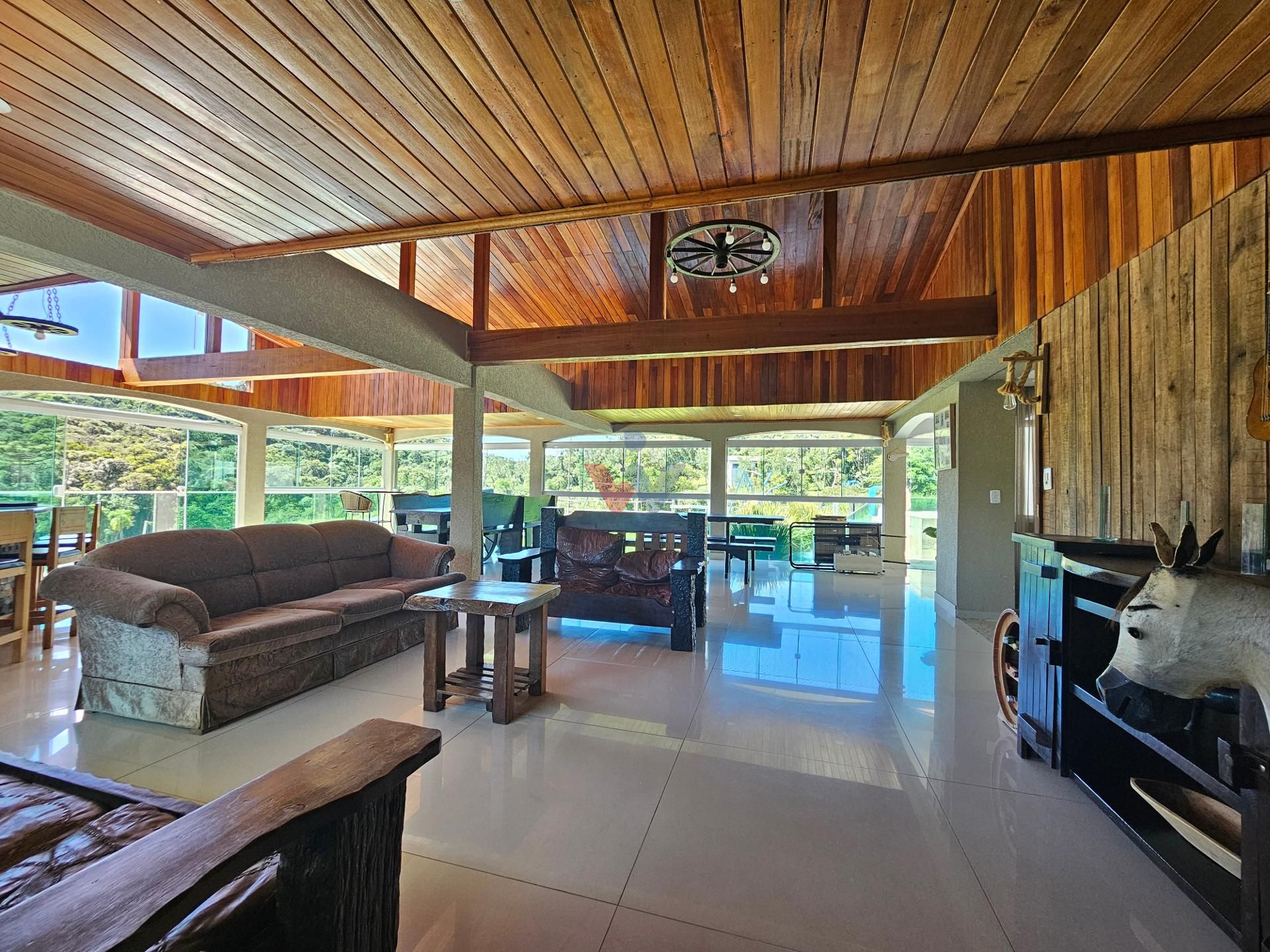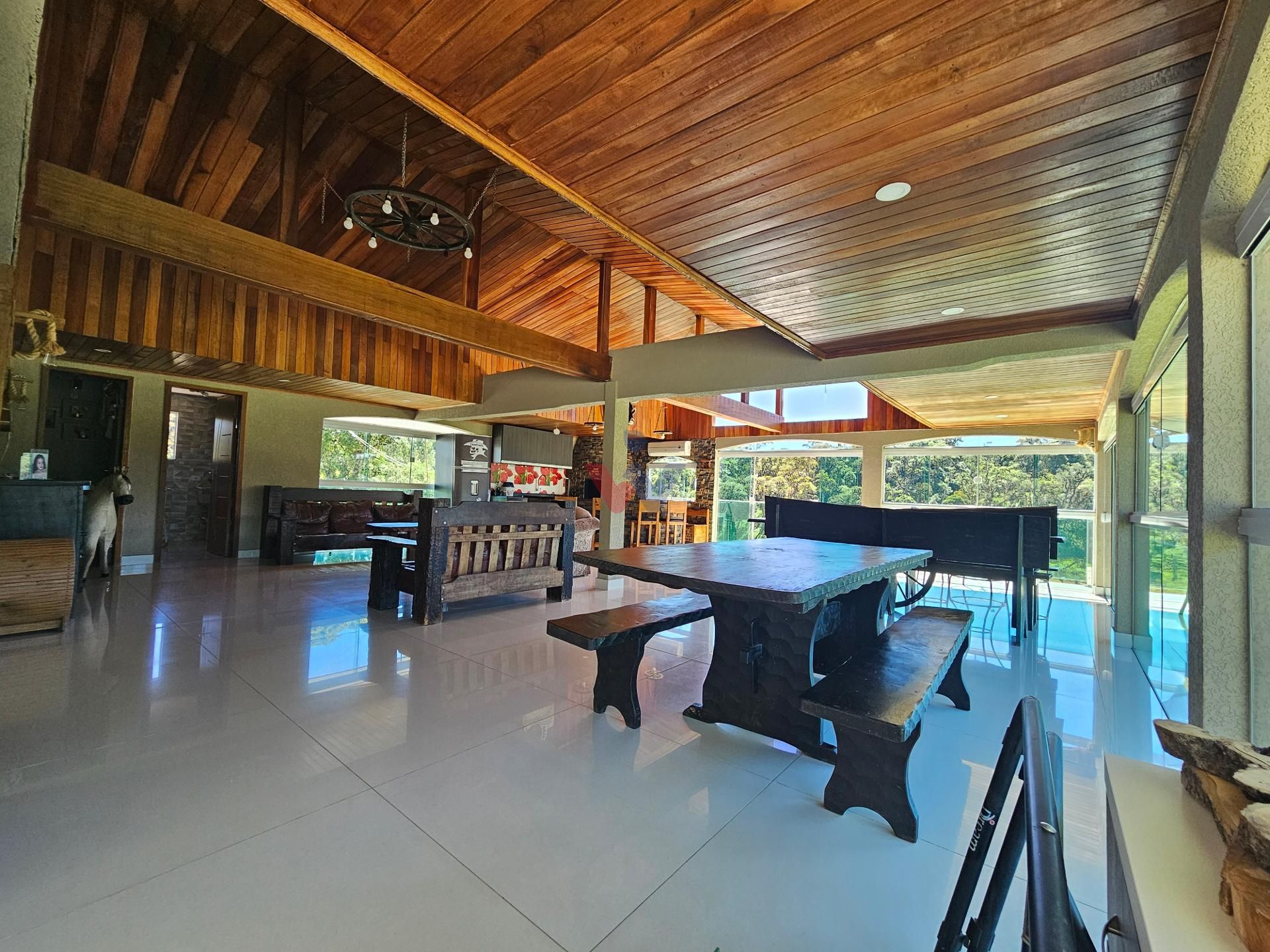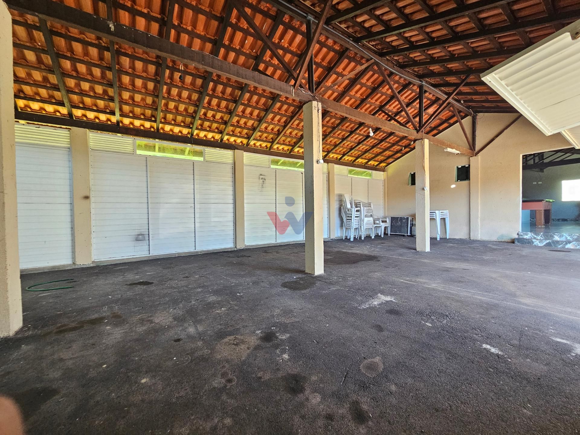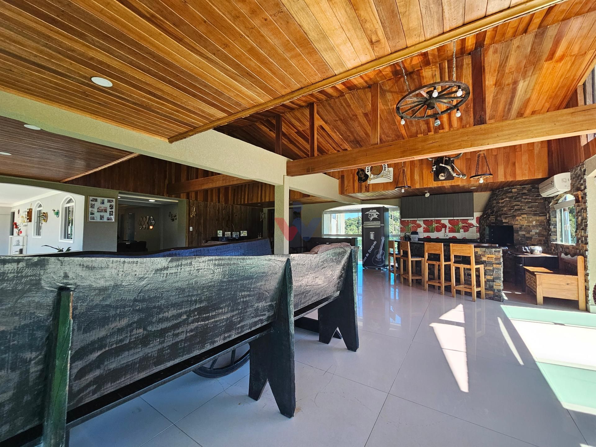 Logo na entrada, à direita, há garagem coberta e fechada com portão basculante para até 4 carros. No mesmo espaço encontra-se um salão de jogos, equipado com mesa de sinuca, churrasqueiras e 02 banheiros. A propriedade conta ainda com depósito para materiais e ferramentas, canil e baia para cavalos, oferecendo excelente estrutura para quem aprecia vida no campo.