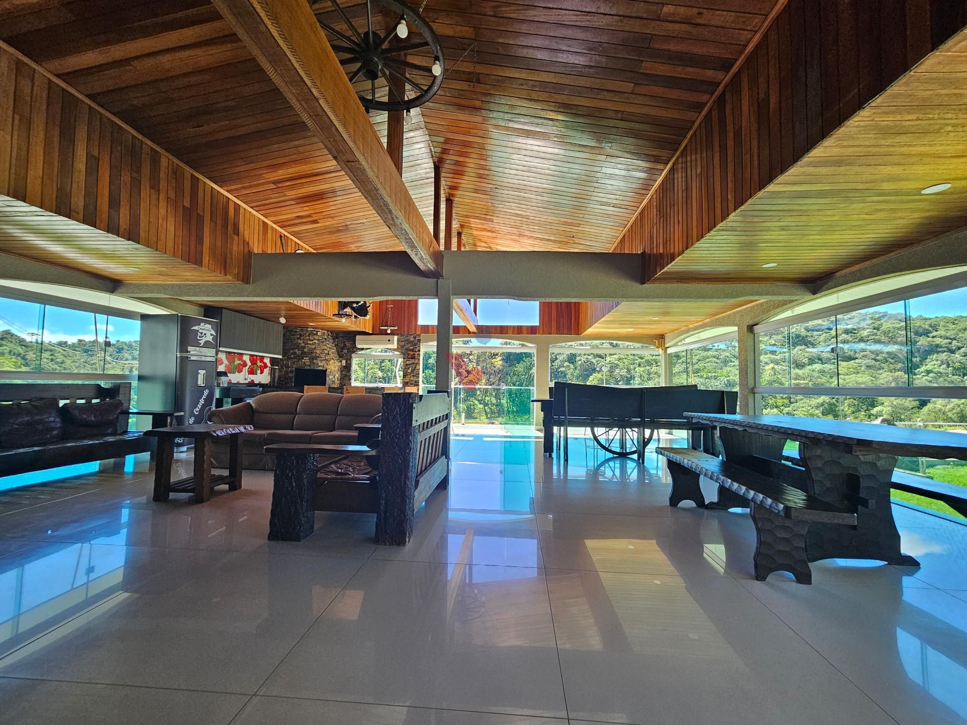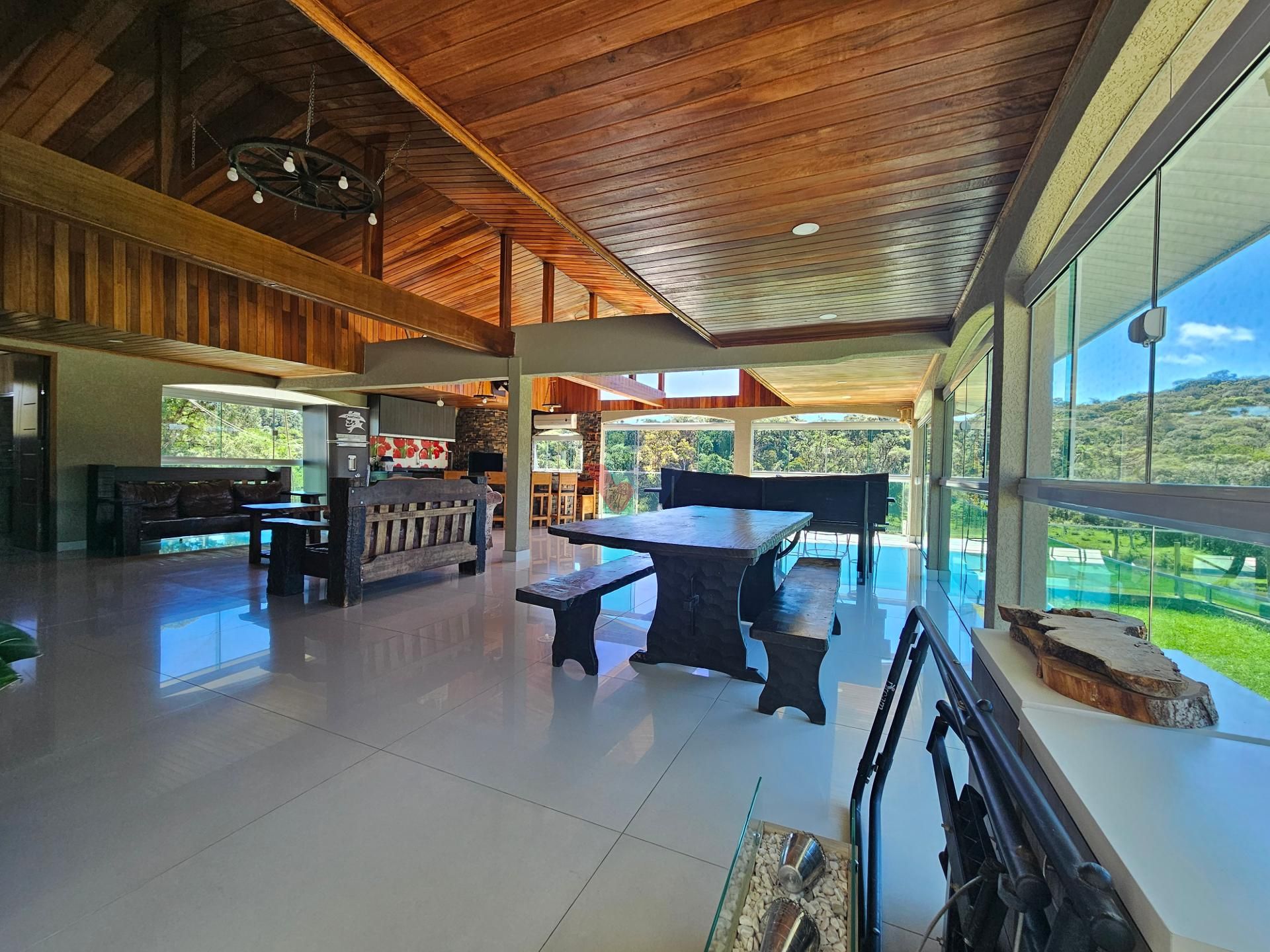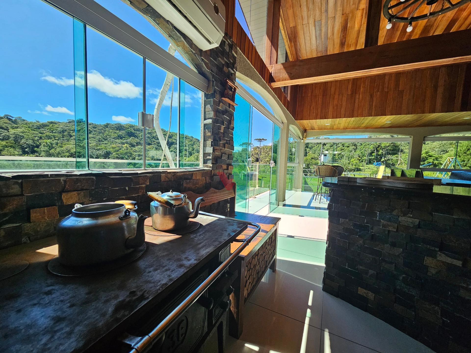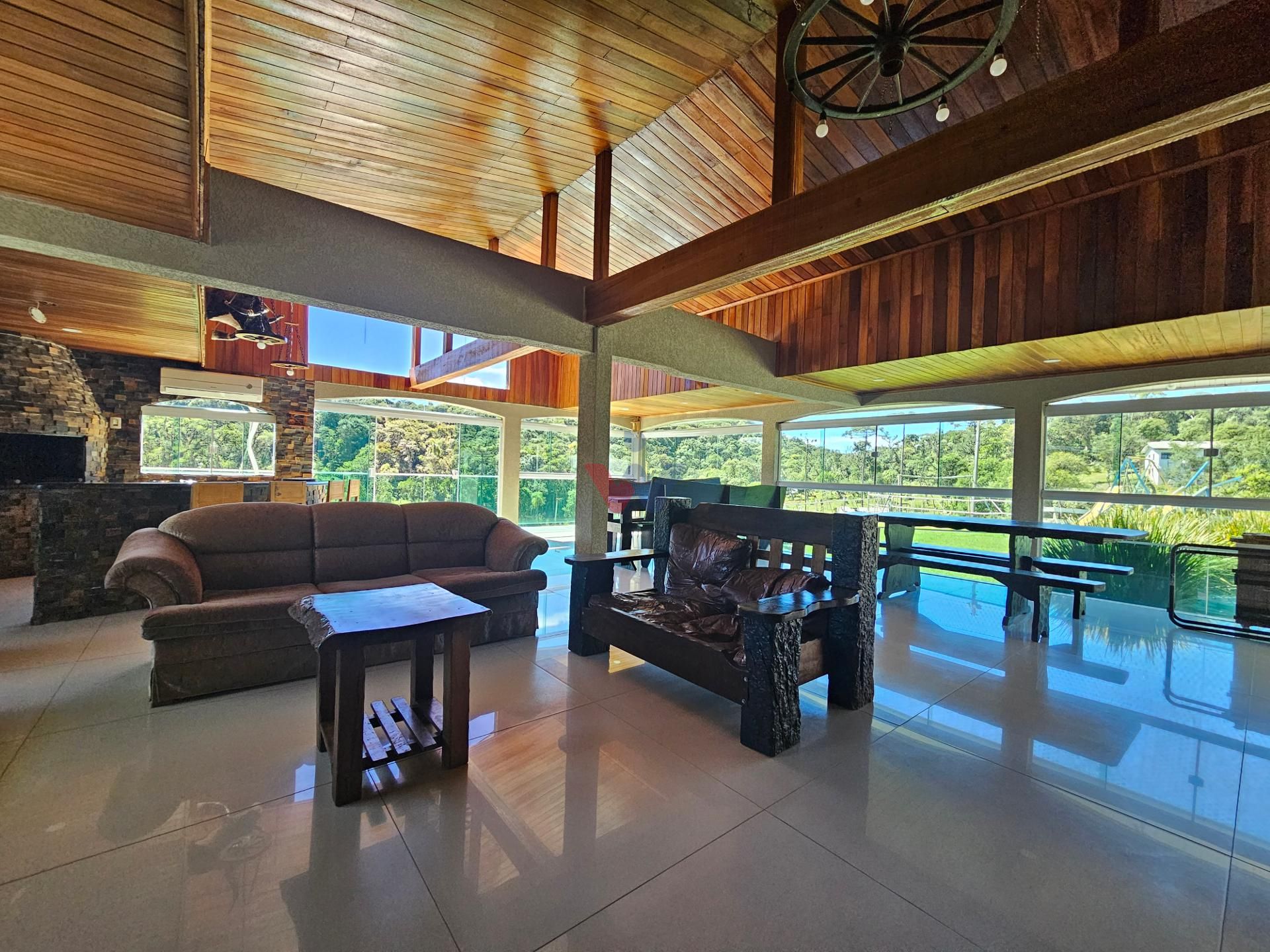 Para momentos especiais de confraternização, a propriedade dispõe de um amplo salão de festas, equipado com churrasqueira, fogão a lenha e banheiro, além de uma vista privilegiada para a exuberante área de mata nativa e para os lagos localizados ao fundo da propriedade.