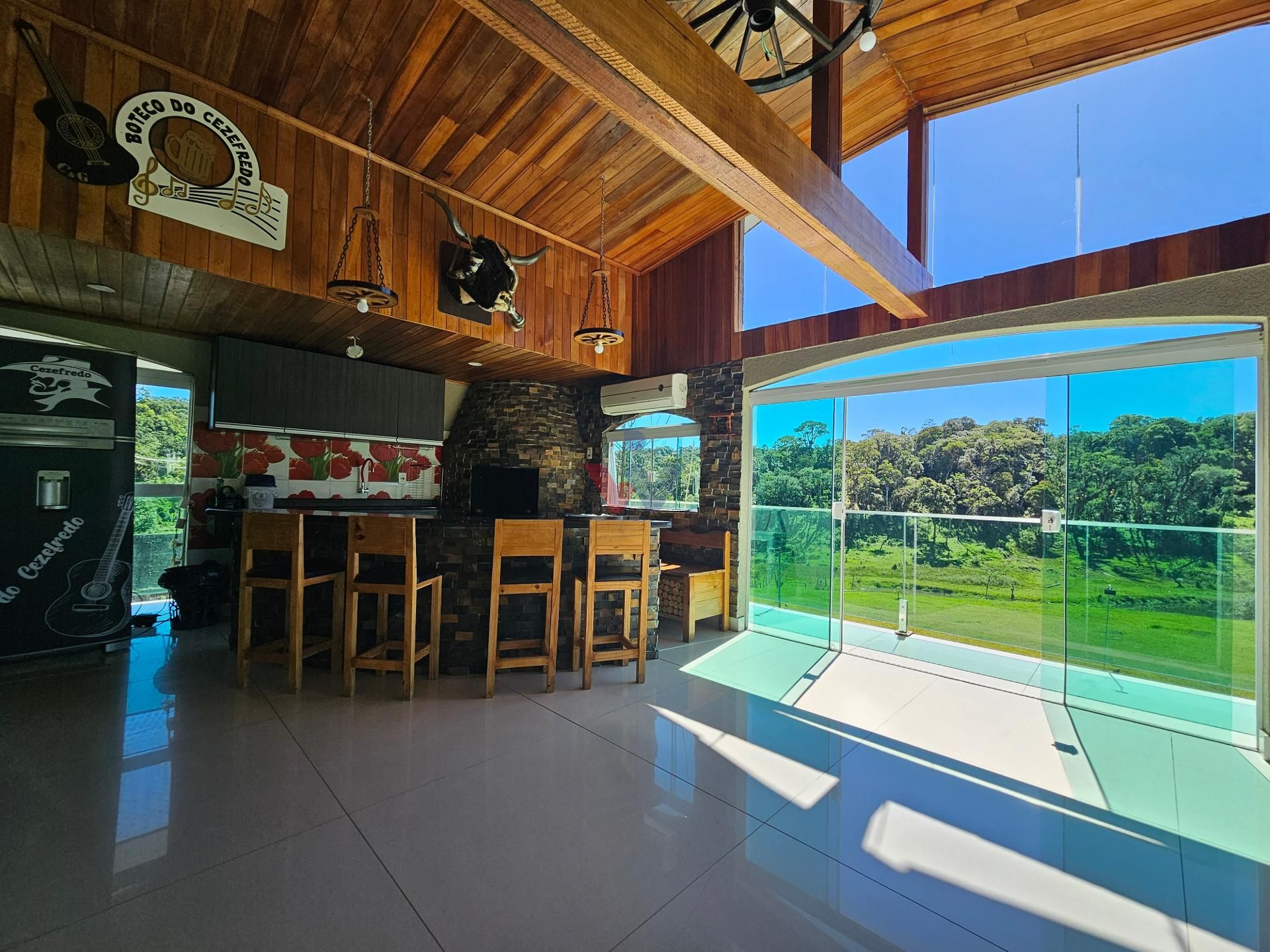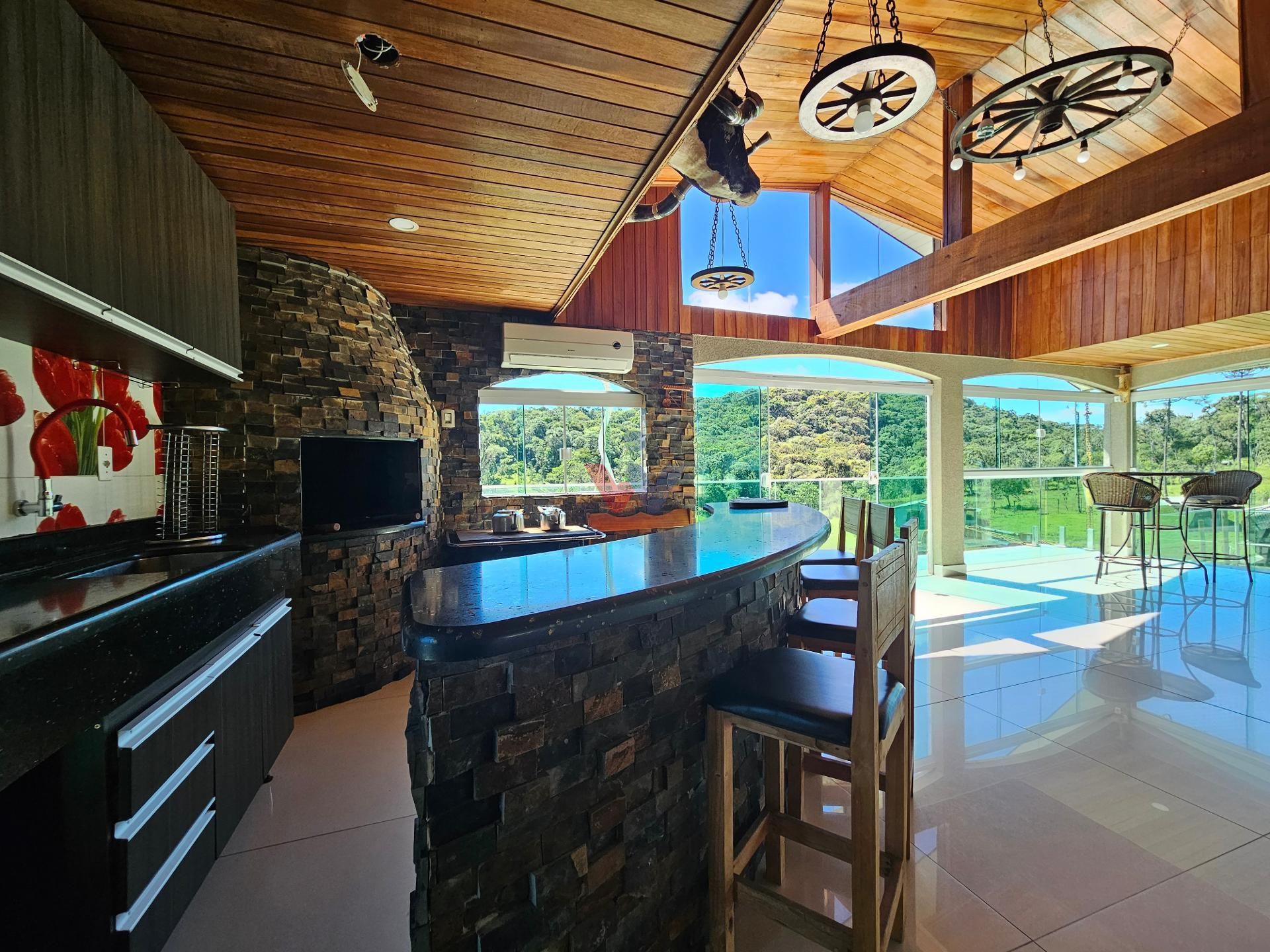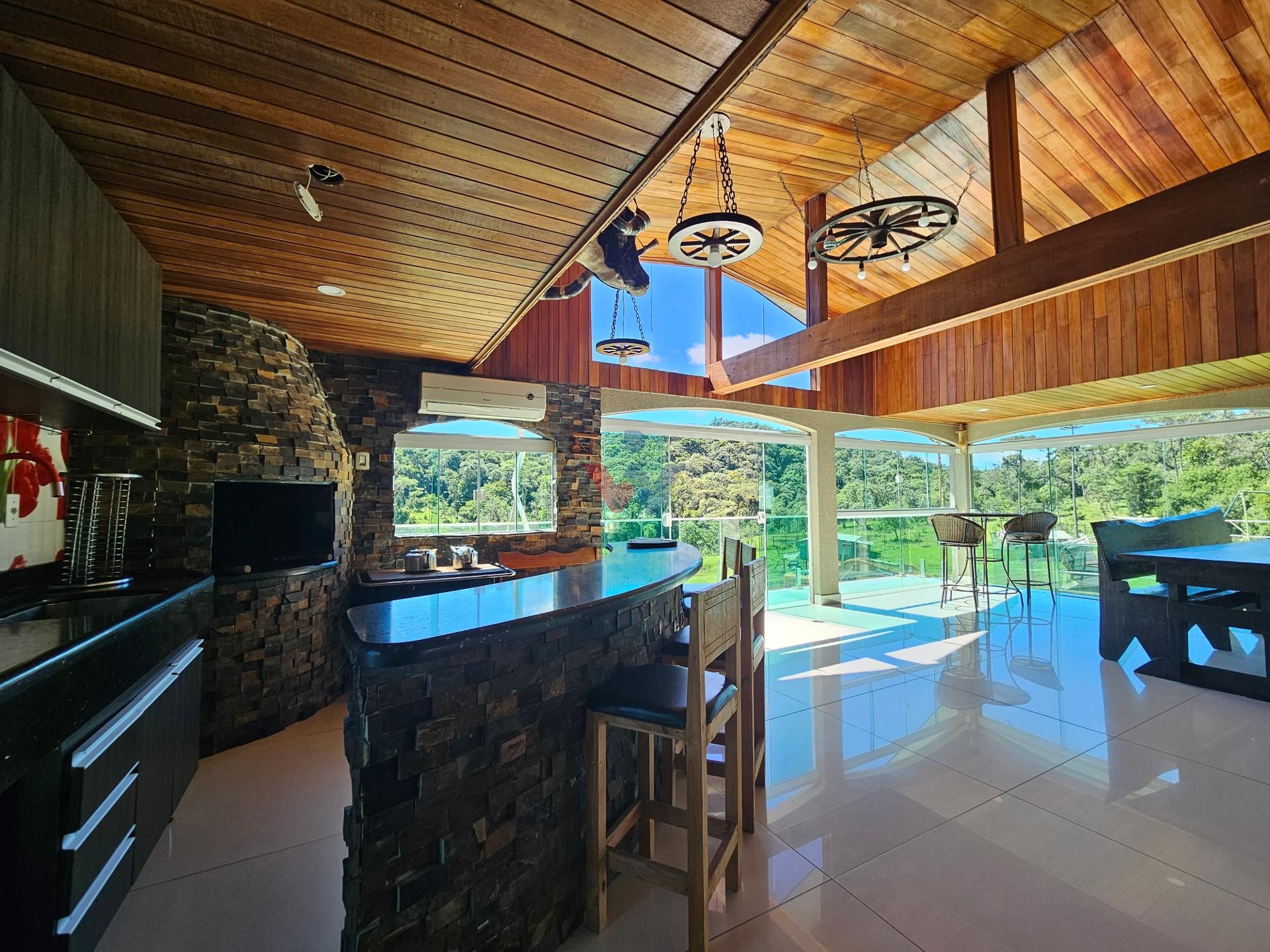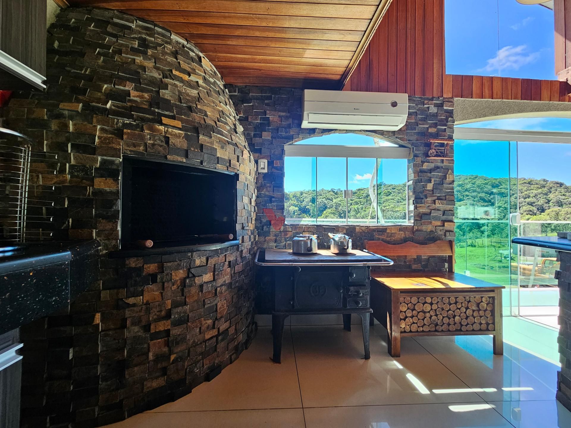 Para momentos especiais de confraternização, a propriedade dispõe de um amplo salão de festas, equipado com churrasqueira, fogão a lenha e banheiro, além de uma vista privilegiada para a exuberante área de mata nativa e para os lagos localizados ao fundo da propriedade.