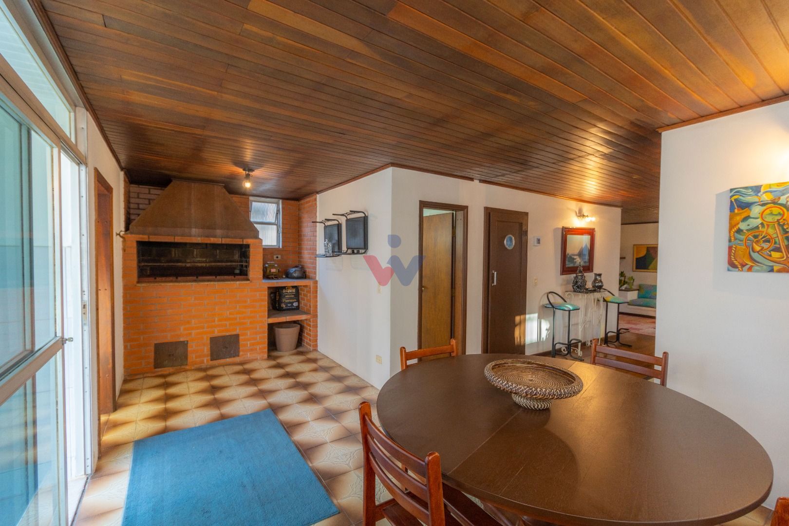 2 salas com sofás, sala de jantar, sauna, churrasqueira e cozinha adicional.
