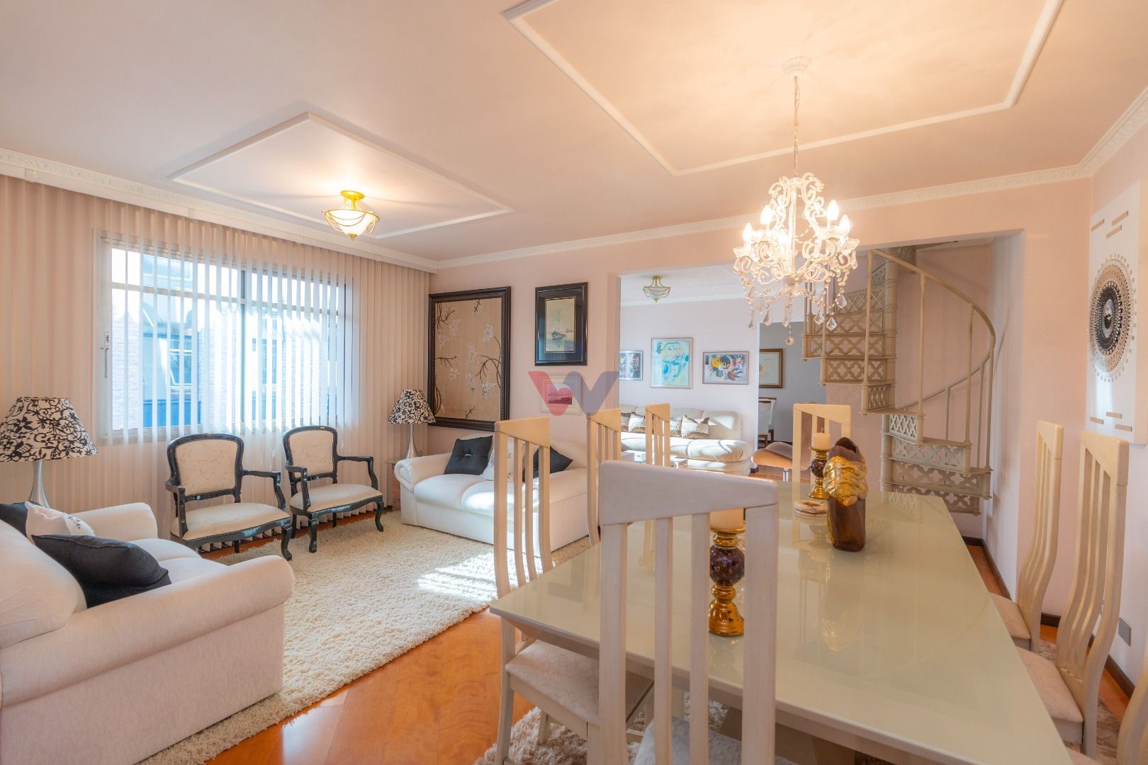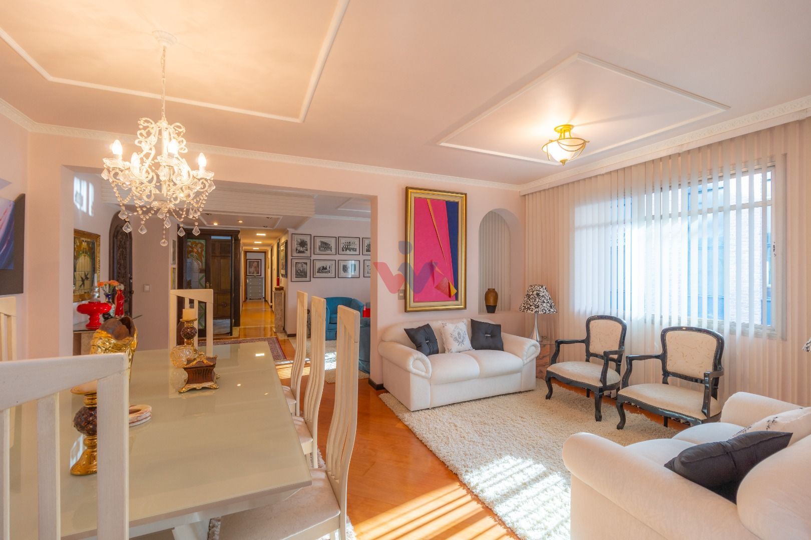 Quatro salas integradas: sala de estar, sala de TV, sala de jantar e copa ao lado da cozinha.