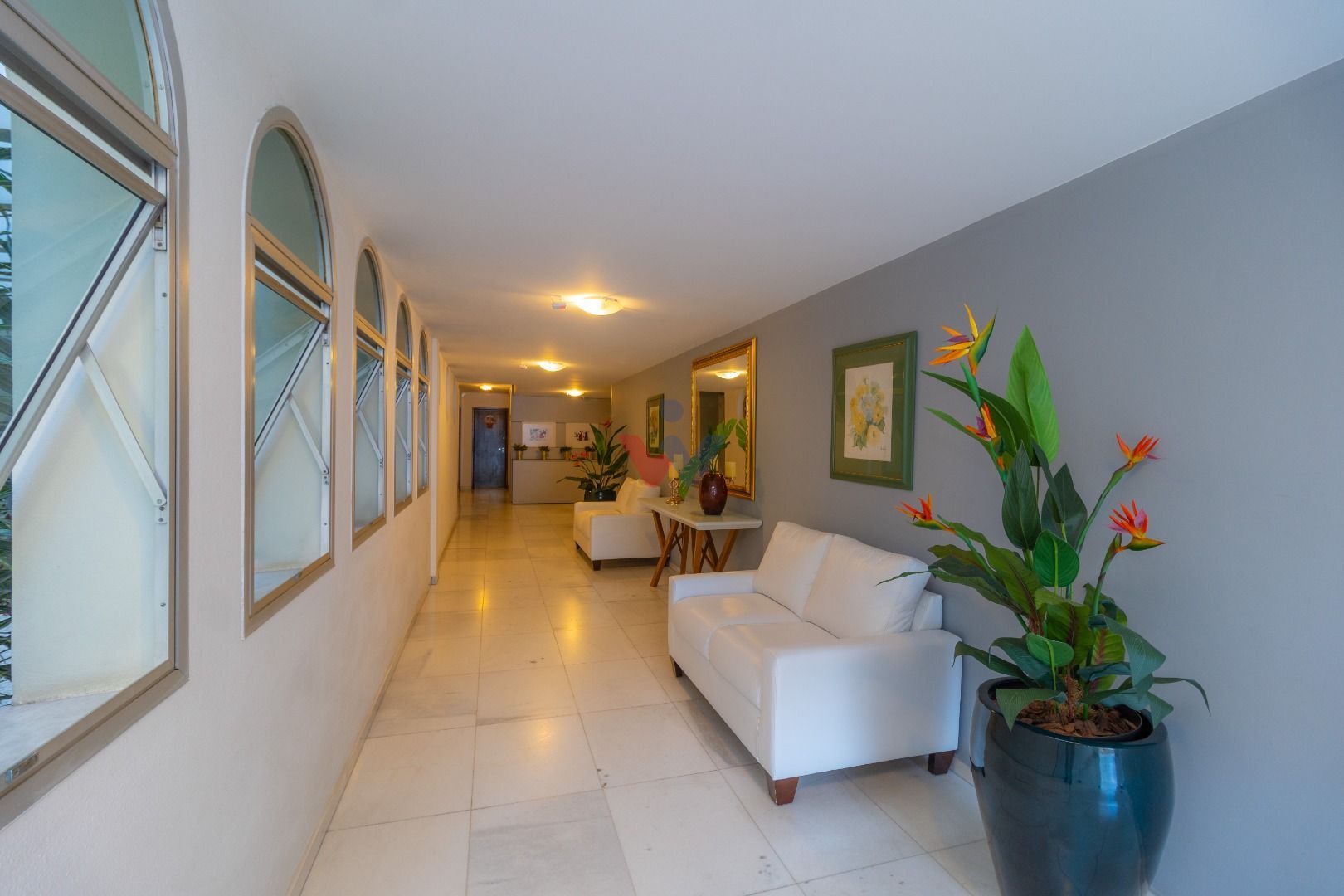 Salão de festas e jardim no piso térreo, com hall de entrada em mármore branco.