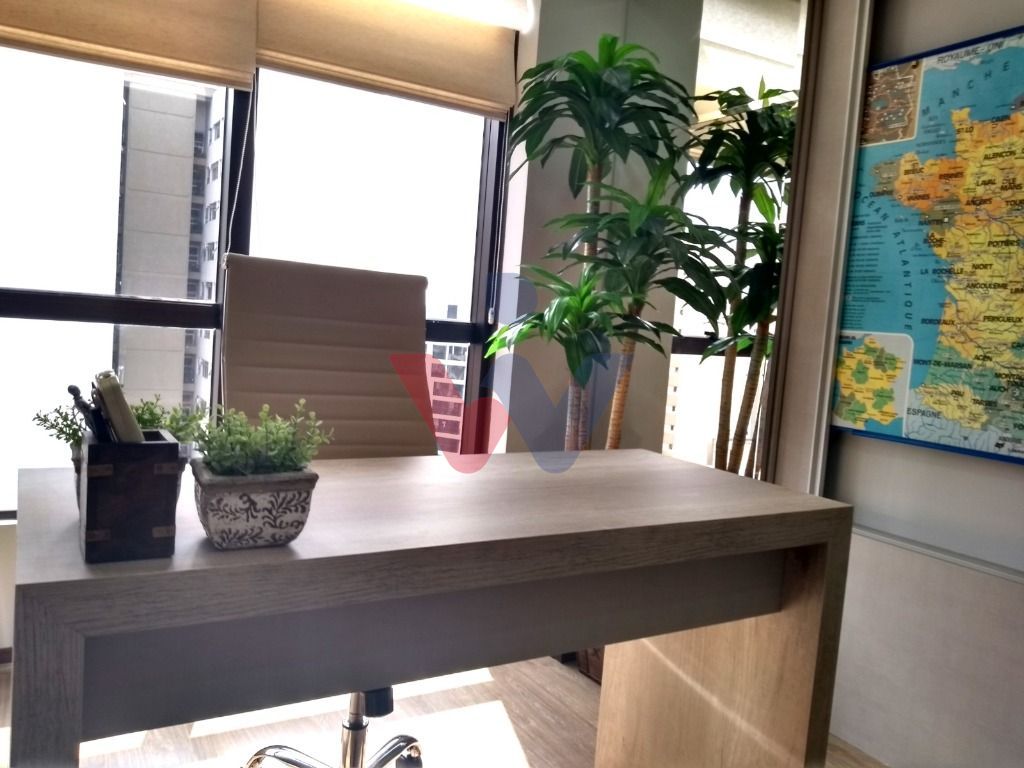 Sala comercial com piso laminado de madeira alto padrão, e será entregue com os armários fixos, escrivaninha, cadeira, tapete, ar condicionado, cortinas (persianas).O imóvel se encontra desocupado, entrega imediata.