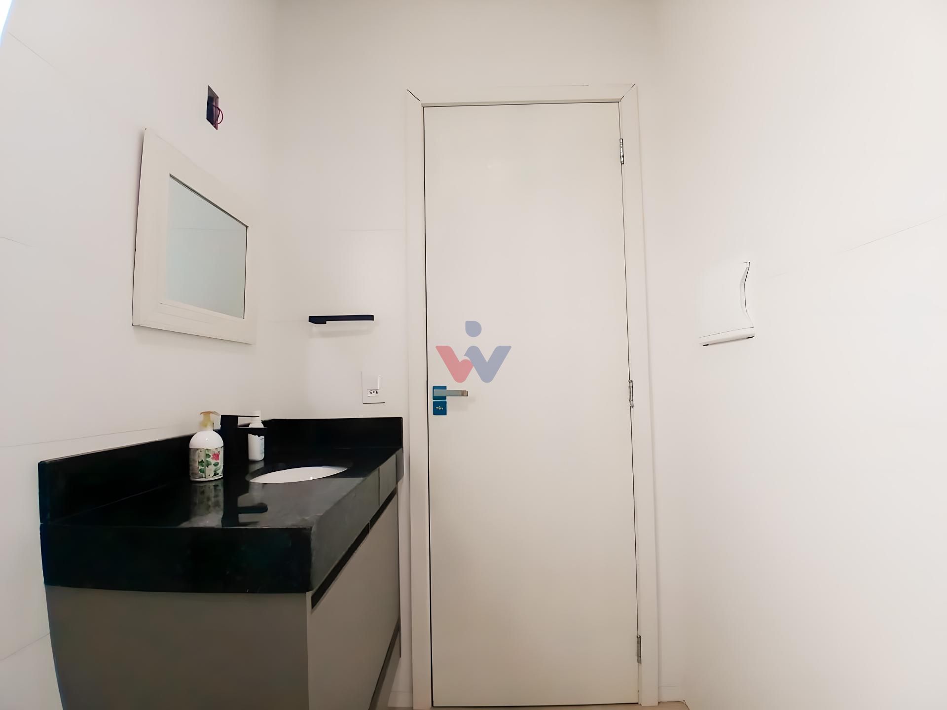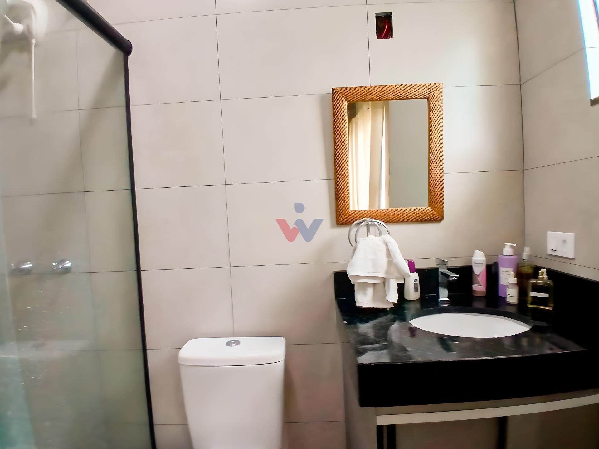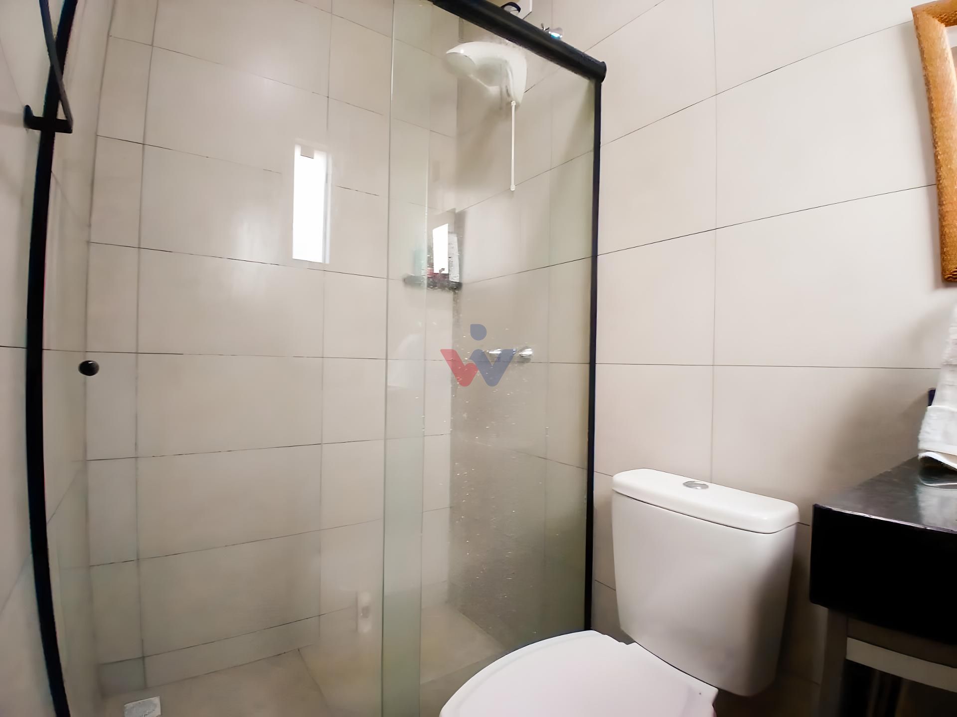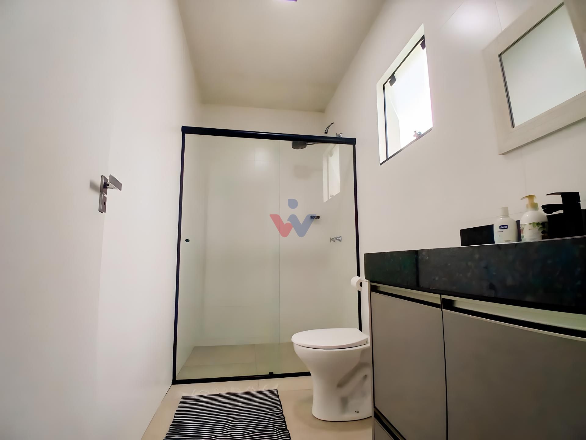 Banheiro social grande, também com armário e box.