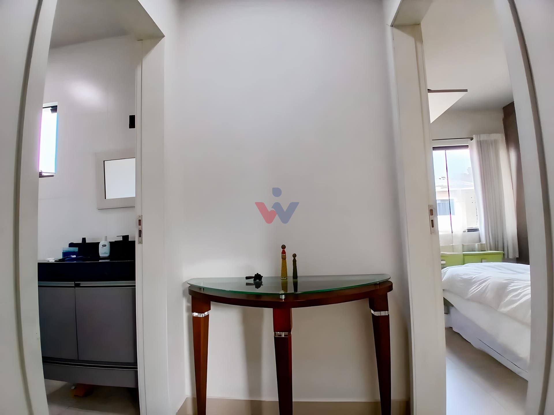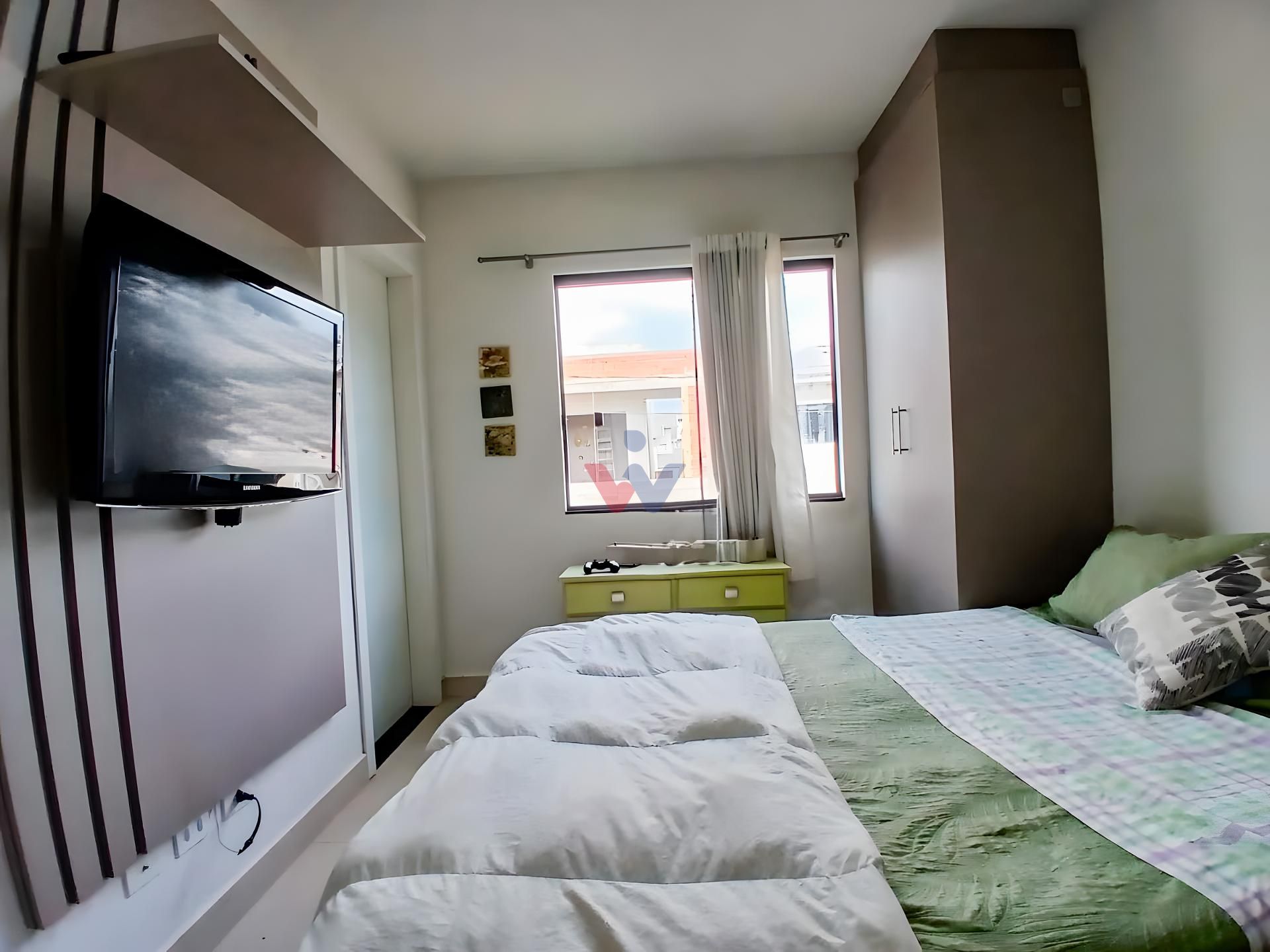 Suíte ampla com armários planejados e painel para TV.