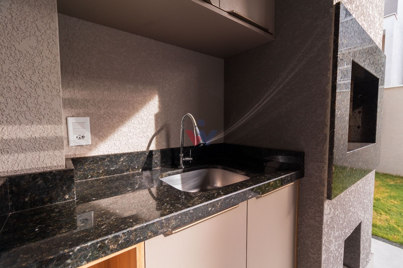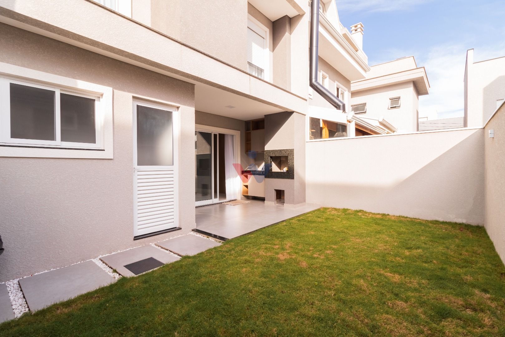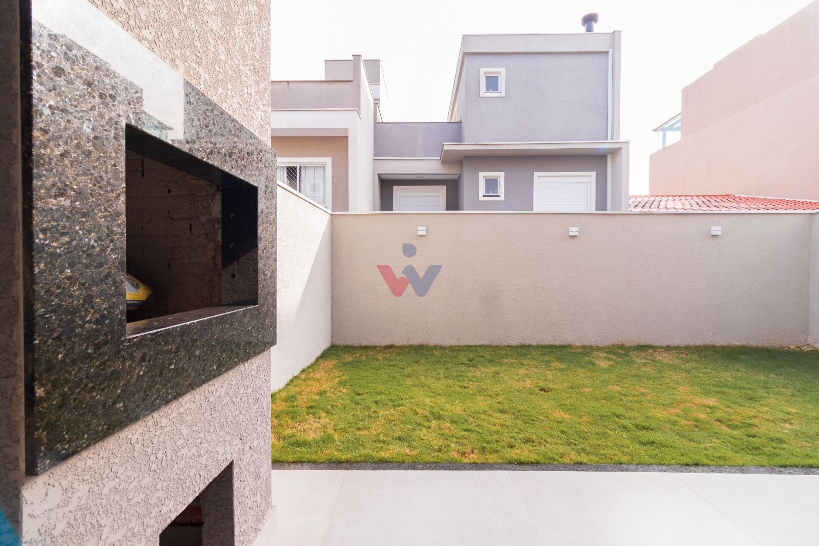 Quintal gramado com churrasqueira, perfeito para lazer em família