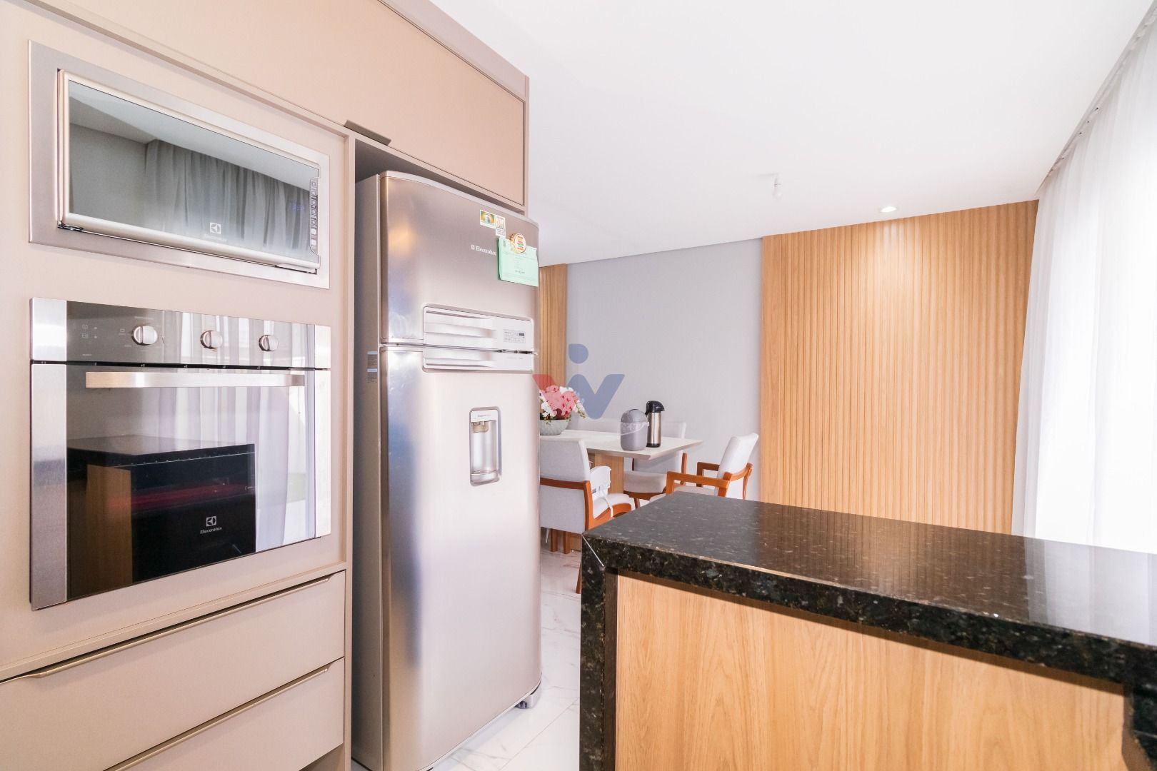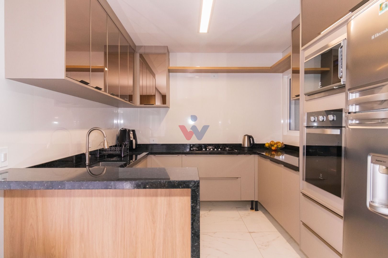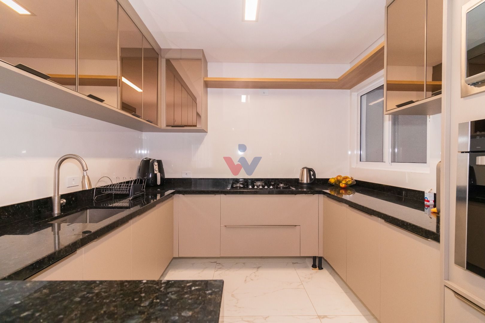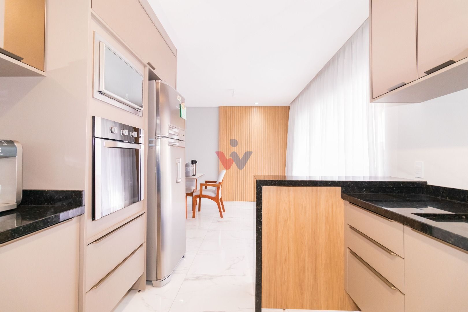 Cozinha espaçosa e totalmente mobiliada, integrada à sala para 2 ambientes