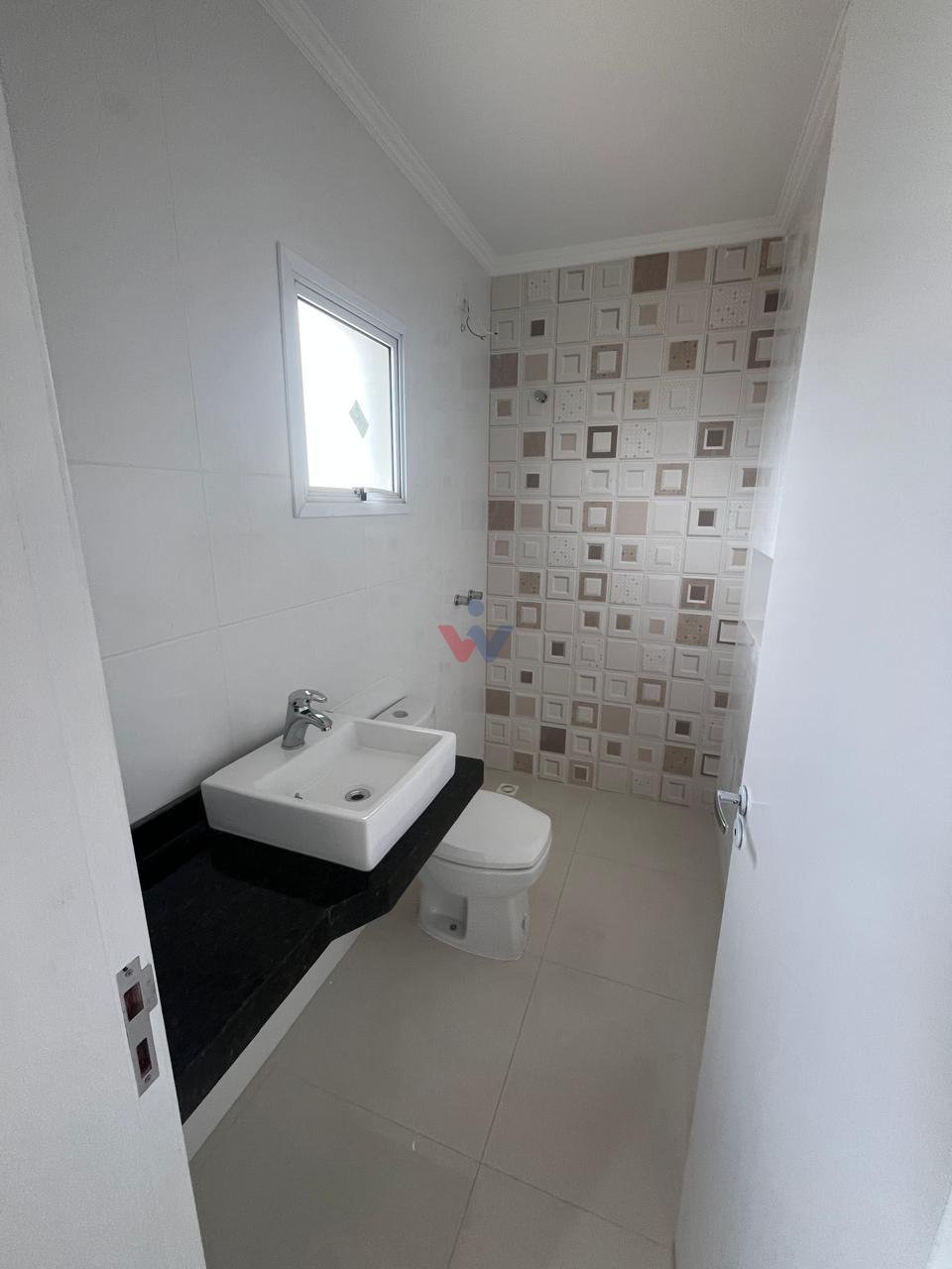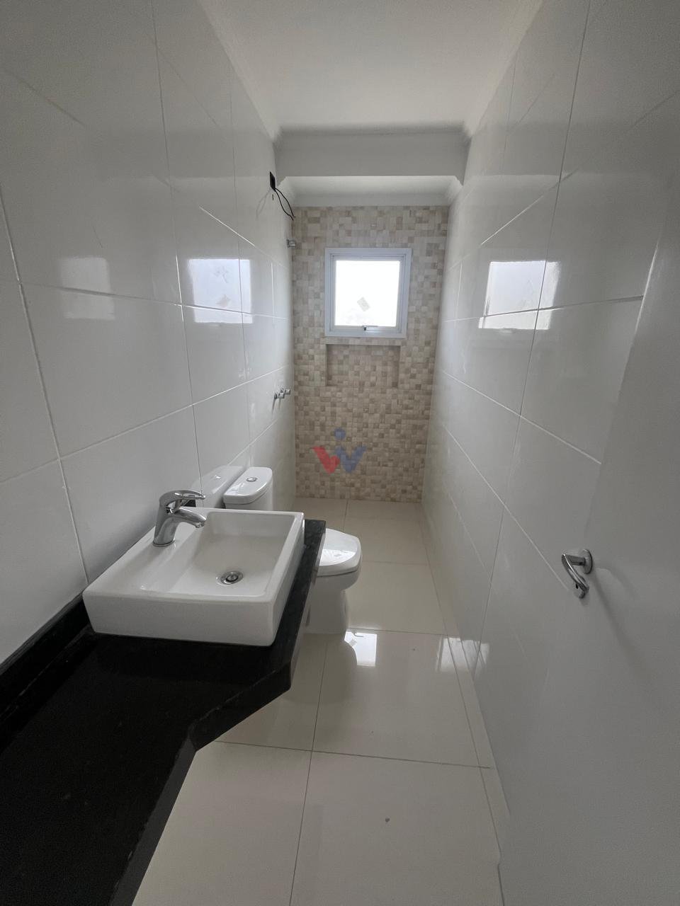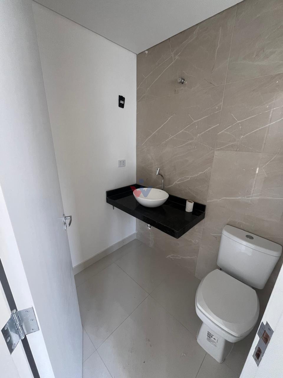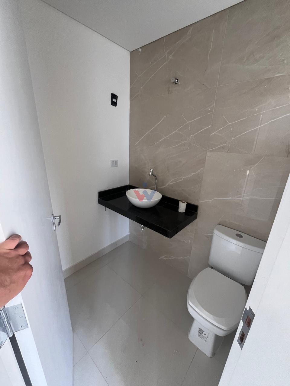 Lavabo no piso inferior e banheiro social no superior