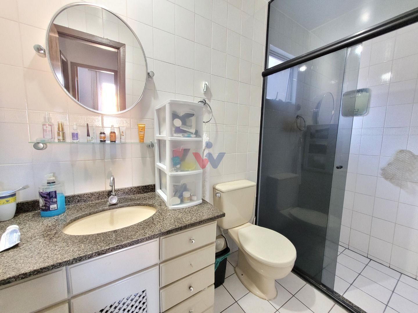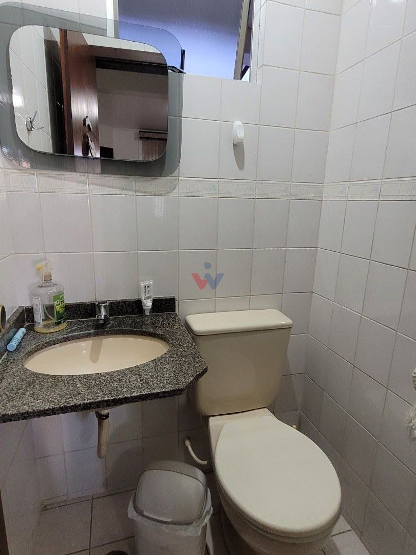 O imóvel conta com dois banheiros .Um deles possui um armário embutido com pia e box e um lavabo.