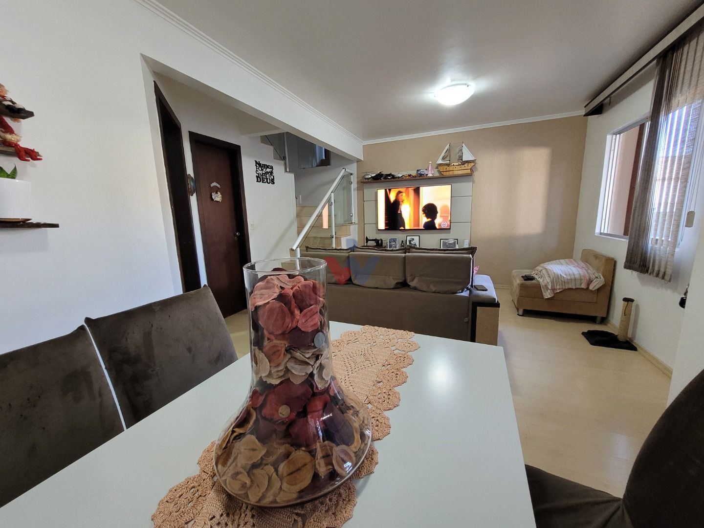 A sala deste sobrado oferece espaço generoso para receber amigos e familiares com conforto.