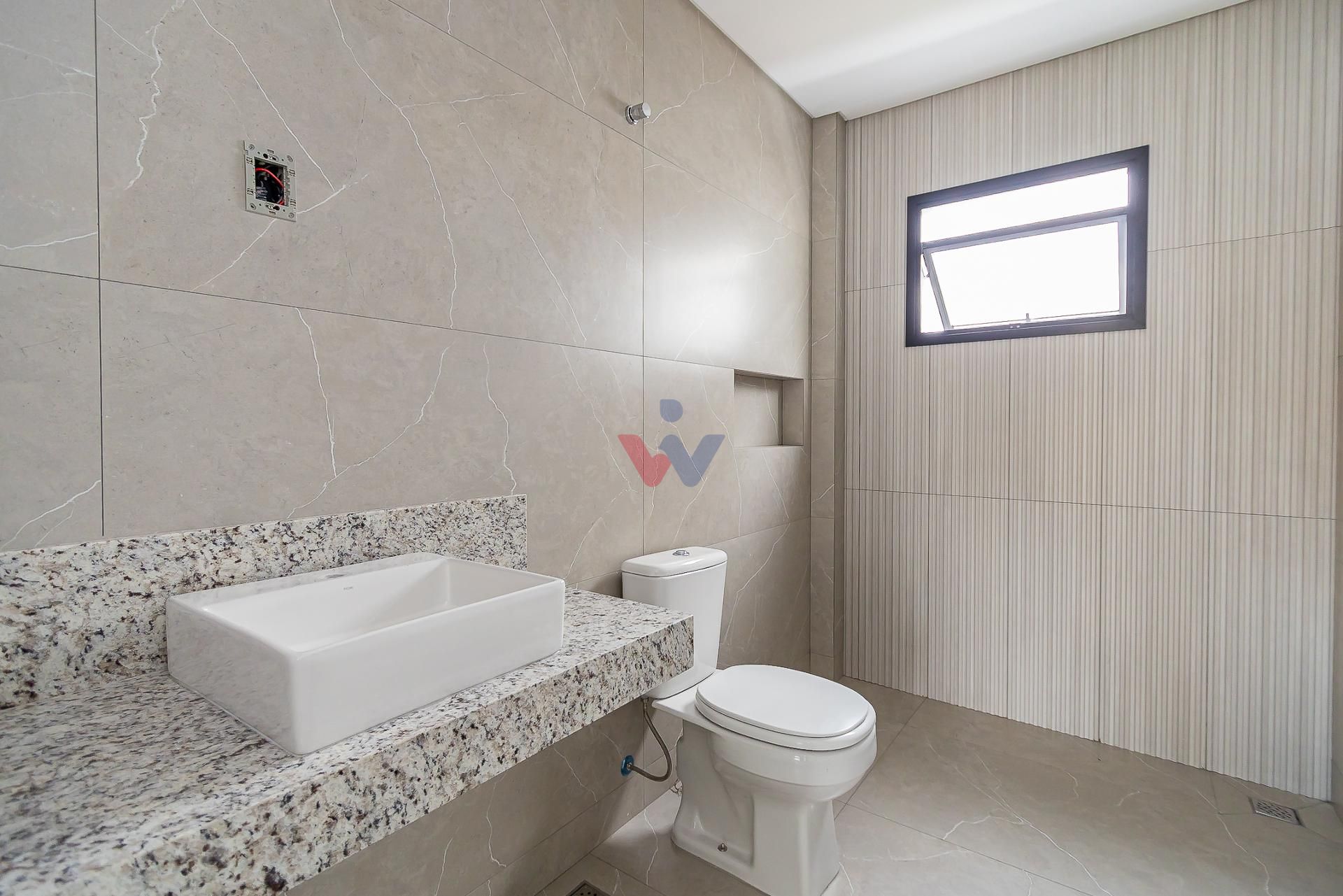 Banheiros modernos, lavabo no térreo e banheiros com cubas em mármore travertino, nichos e aquecimento a gás.