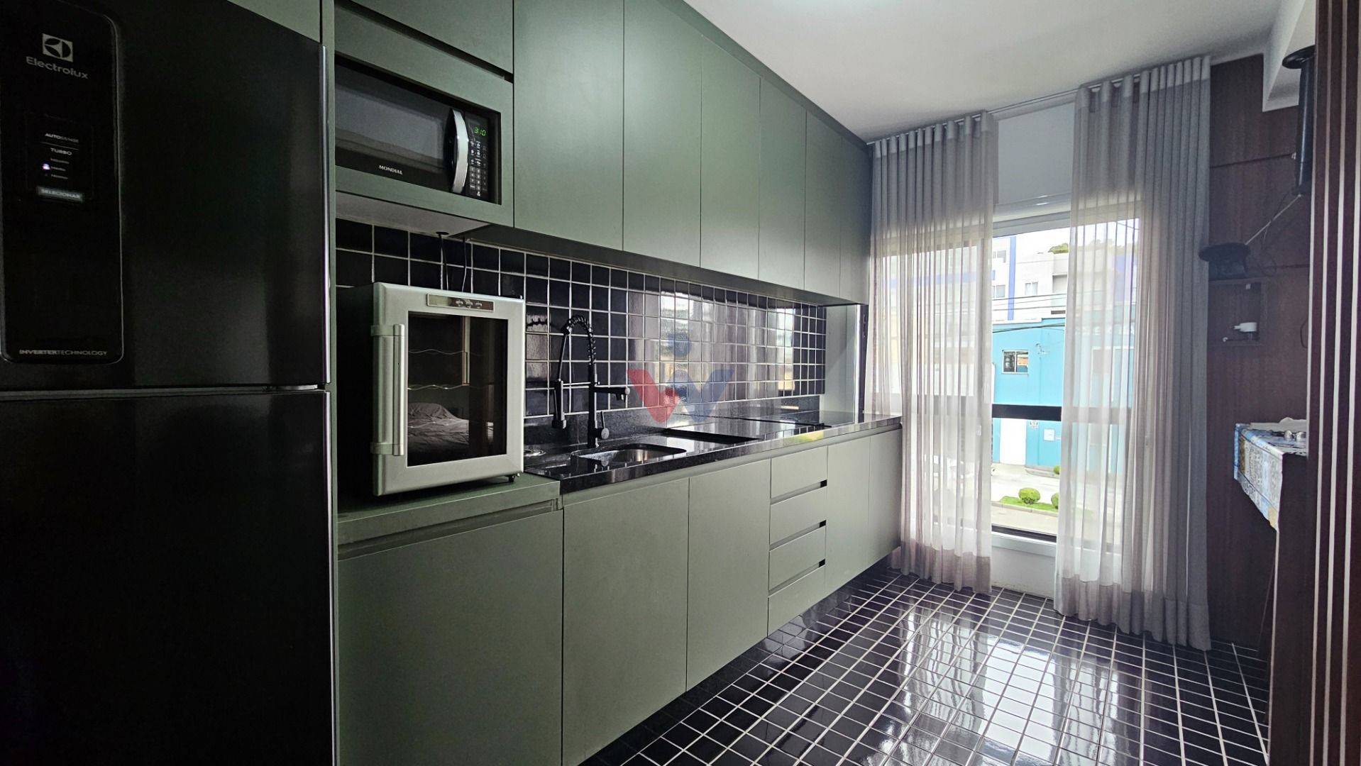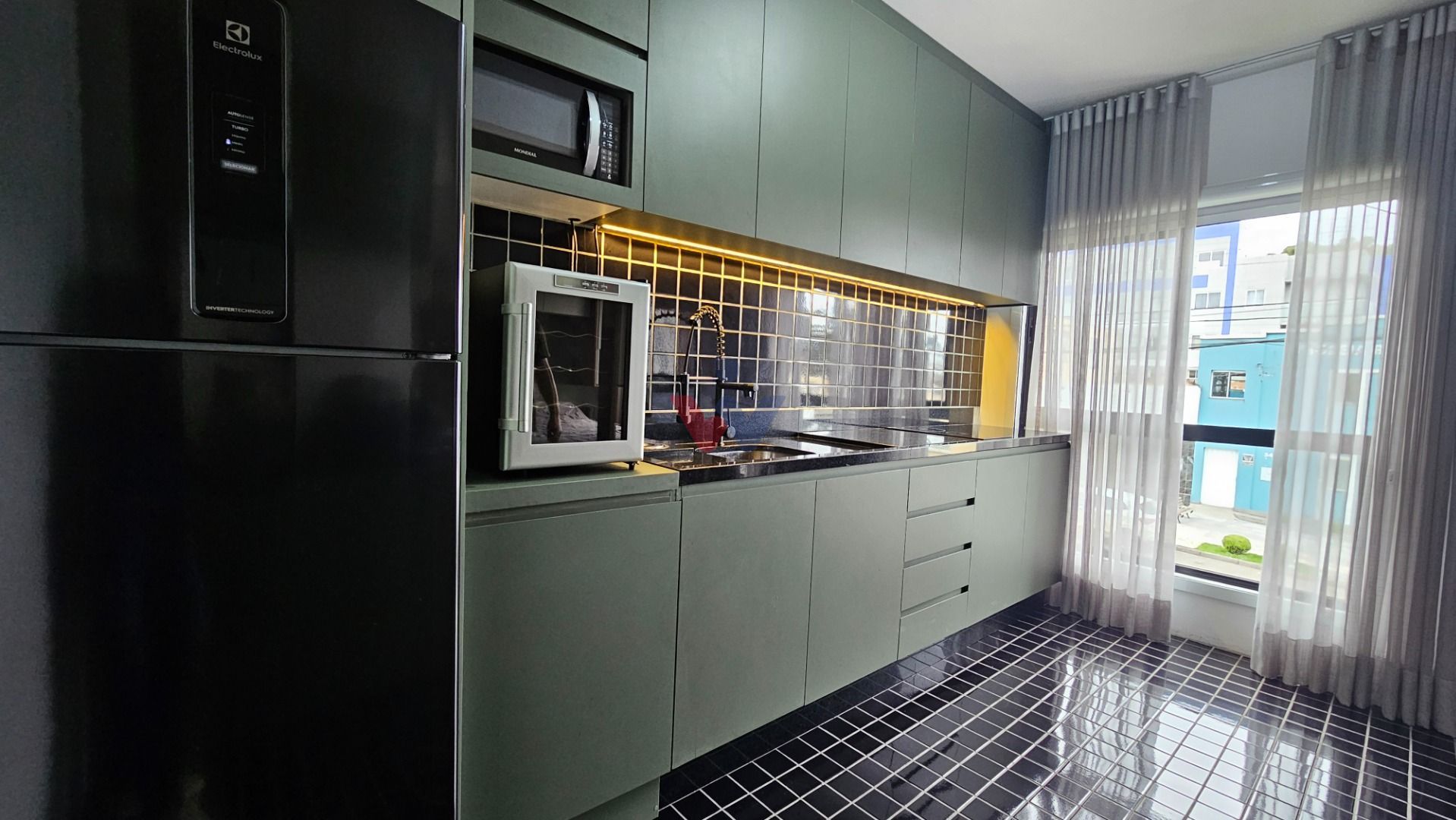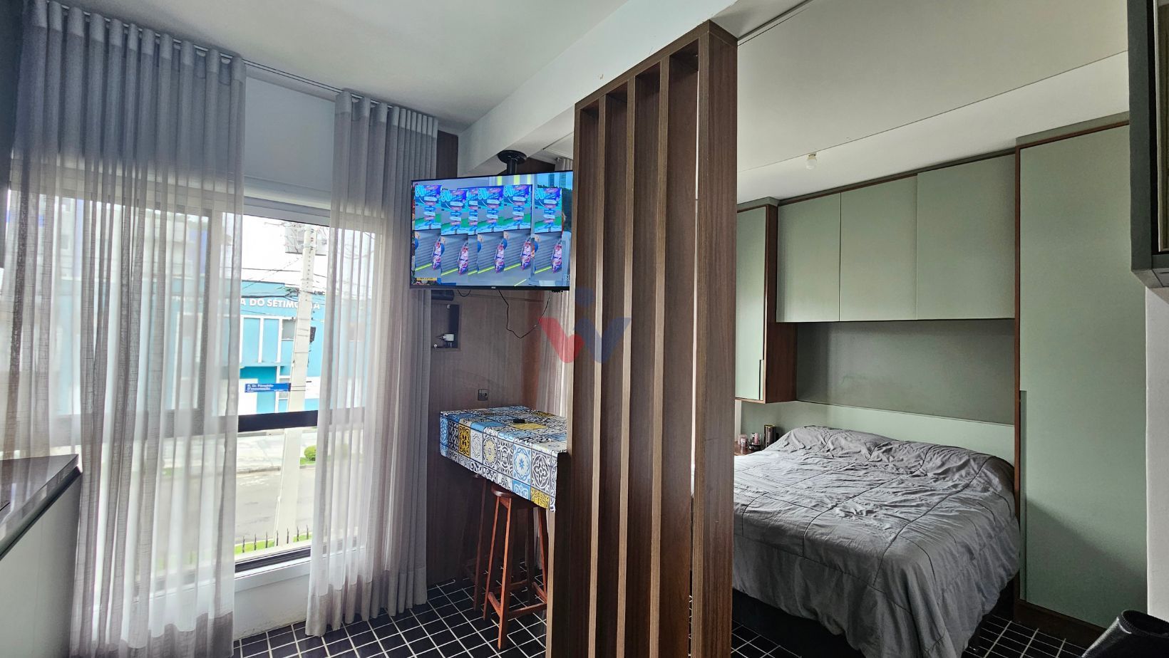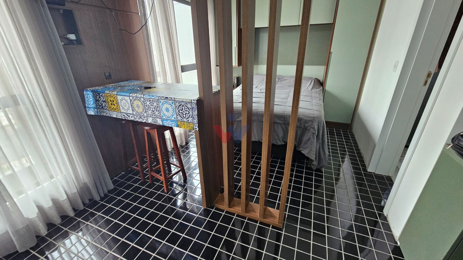 Studio de 25,16 m² totalmente mobiliado e equipado com utensílios. Móveis planejados, cama box, piso moderno, banheiro com box Blindex, cortinas sob medida com blackout para momentos de descanso mais aconchegantes.