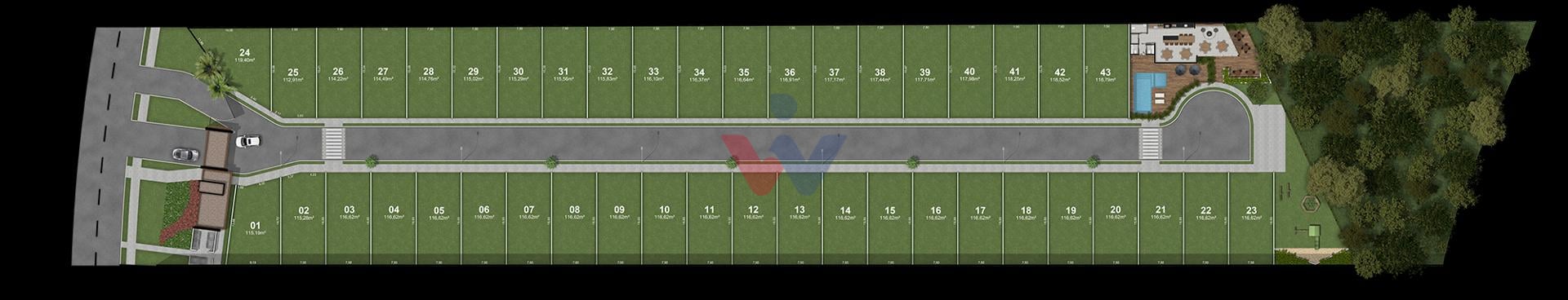 Terreno medindo 7,50 m de frente, 7,50 m de fundos e 15,55 m de largura, totalizando 116,62 m².